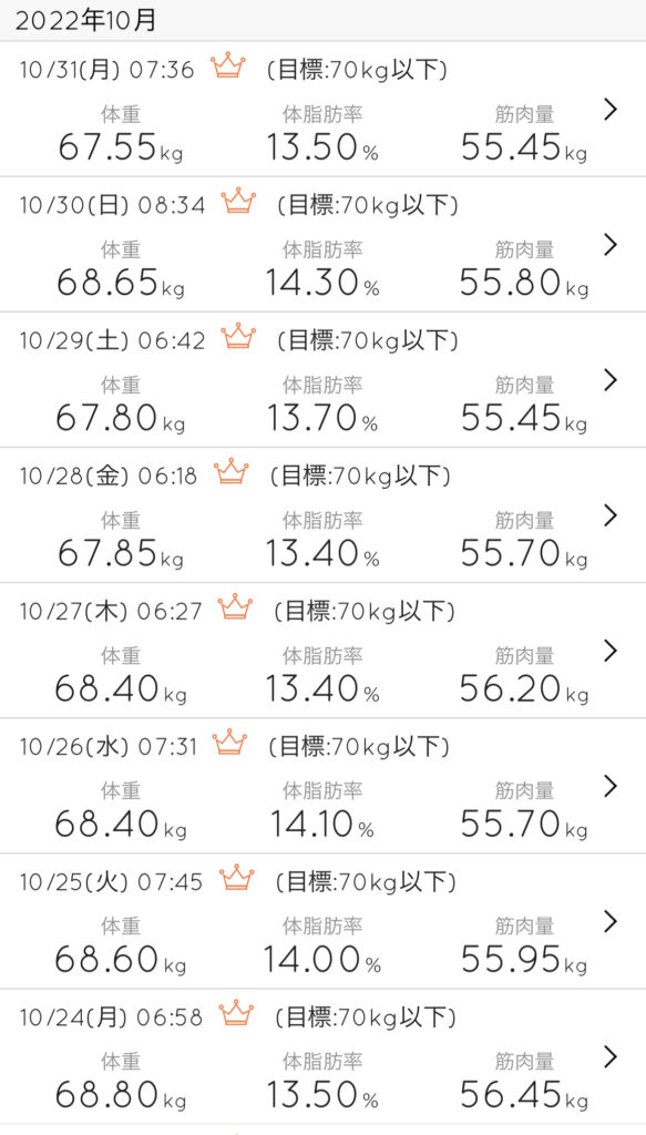週末に少し増えることになると思ったので平日は極力抑えた結果、木・金は体重がついに67kg台に…体脂肪率は13%~14%台で推移。