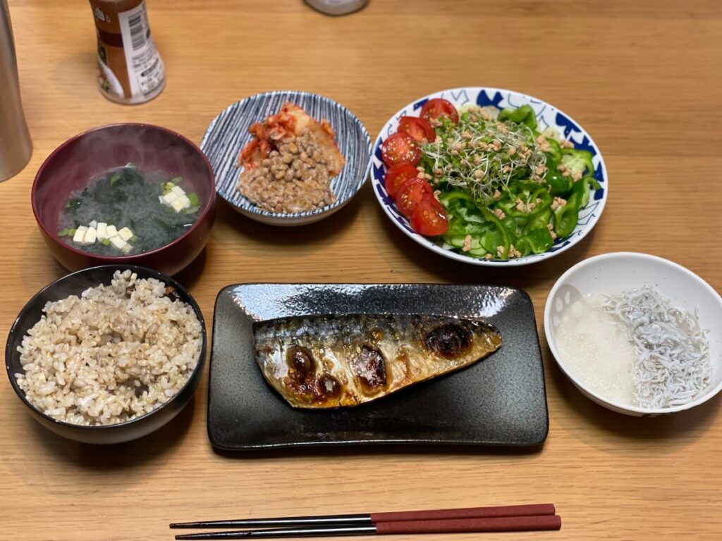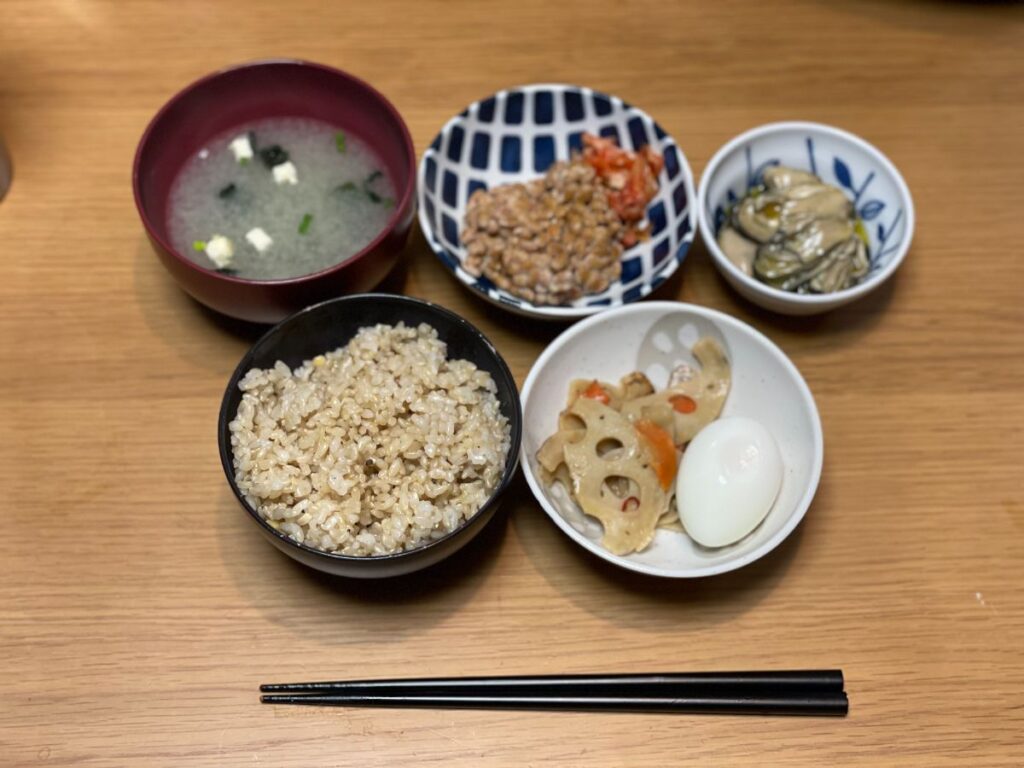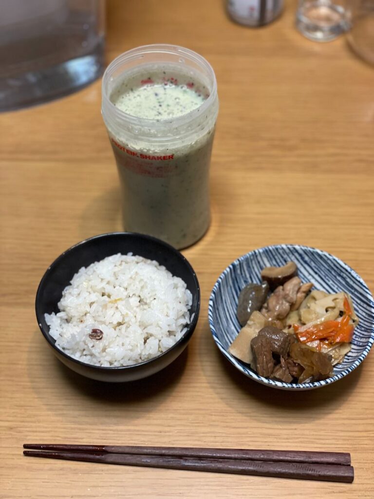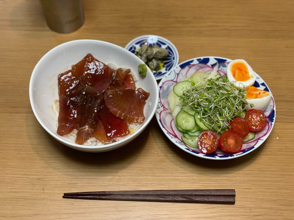 8:30 いつものスムージー、マグロ漬け丼、サラダ、ゆで卵、納豆キムチ、味噌汁