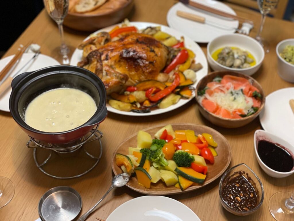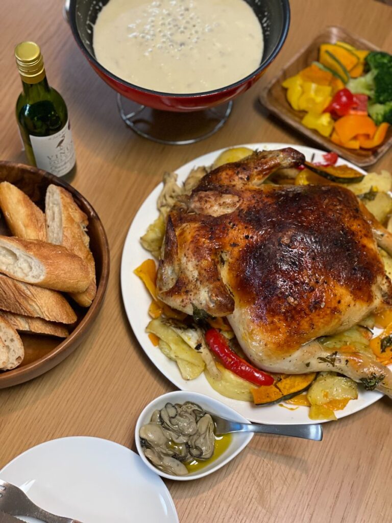 14:30 ローストチキン、チーズフォンデュ、パン、牡蠣オイル漬け、スパークリングワイン1杯