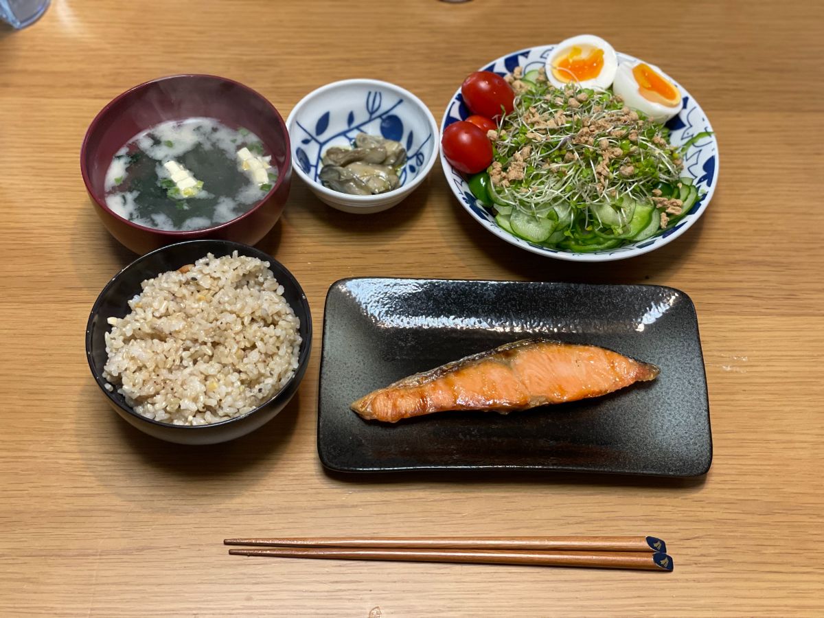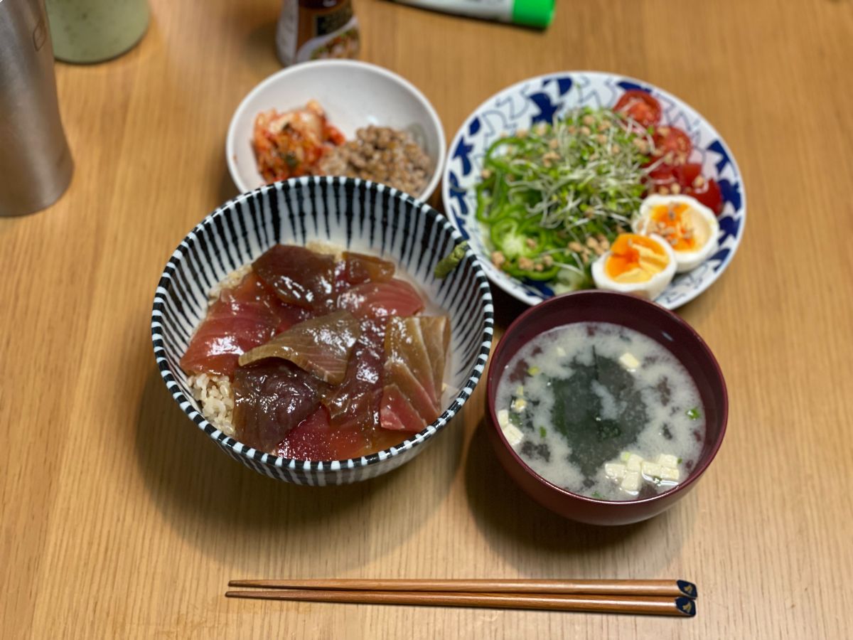 8:30 いつものスムージー、マグロ漬け丼、サラダ、ゆで卵、納豆キムチ、味噌汁