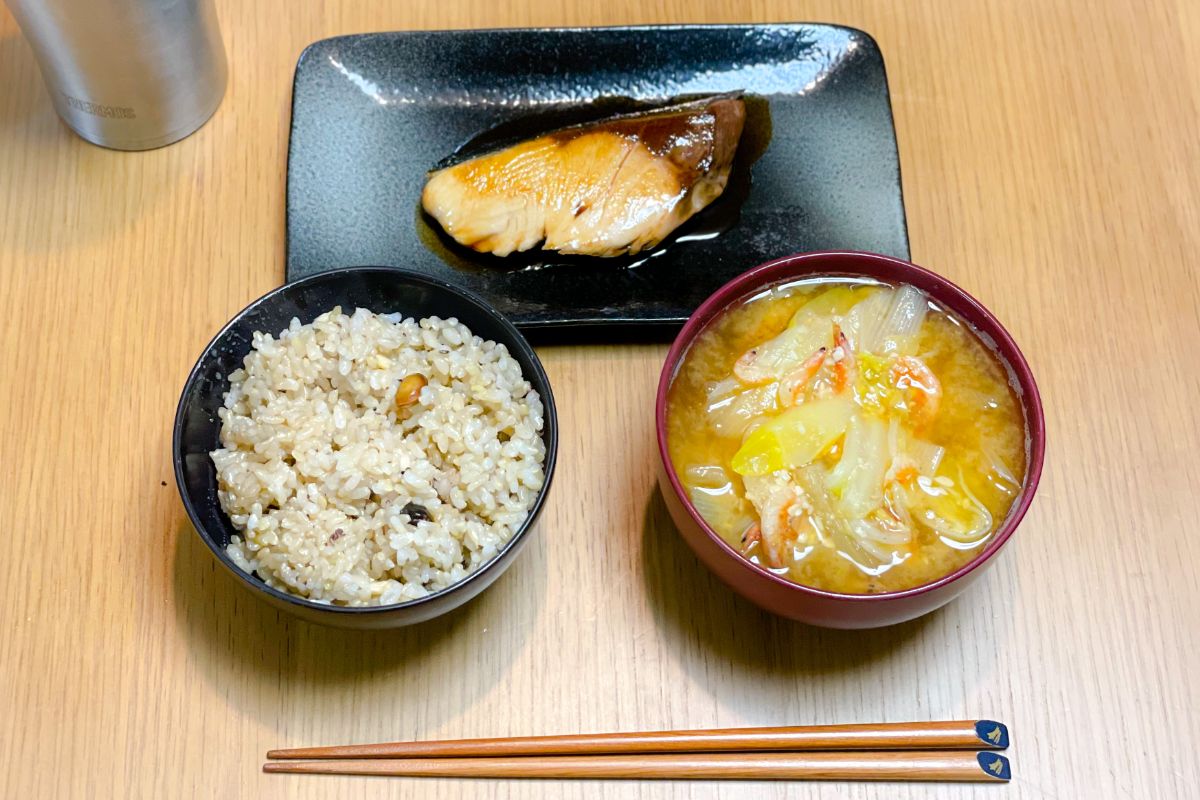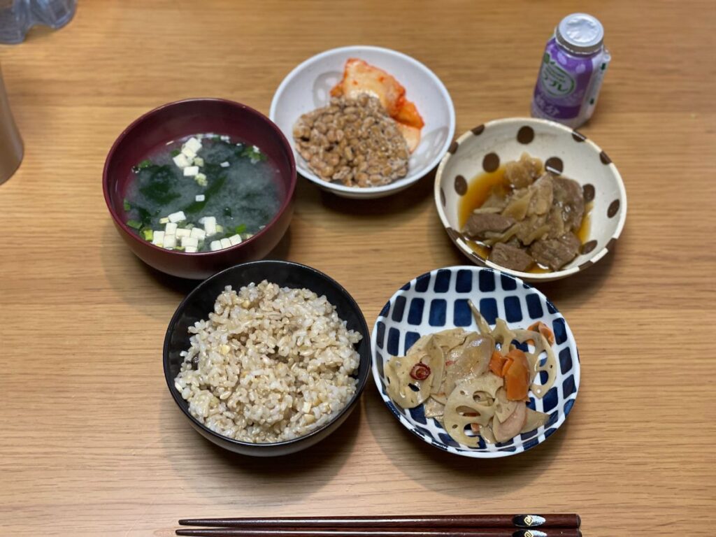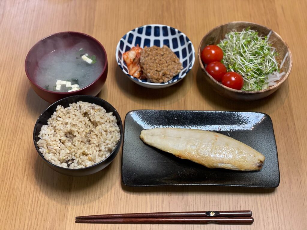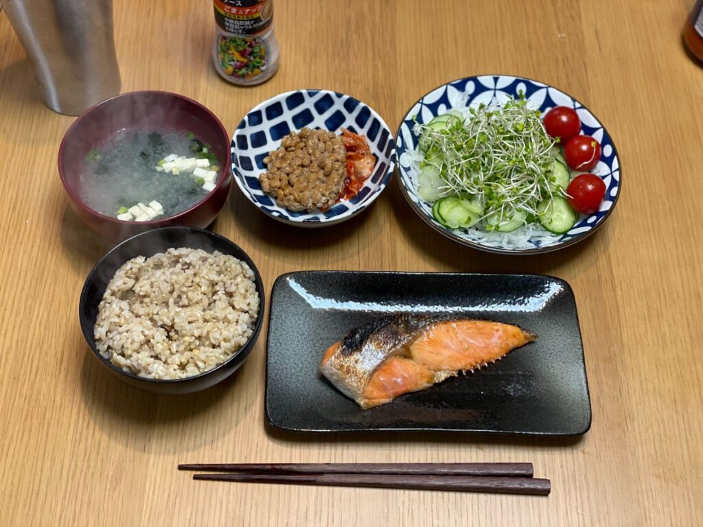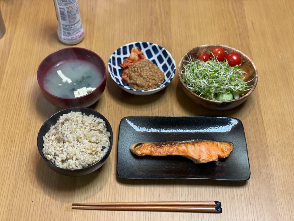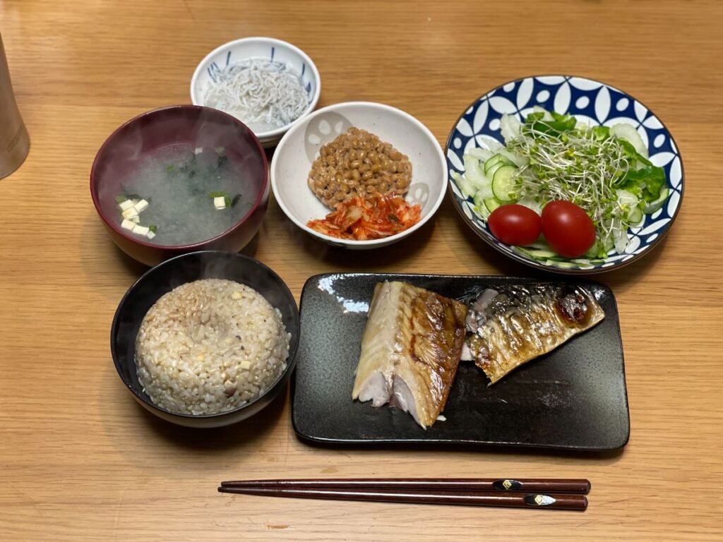 8:30 いつものスムージー、サラダ、アジの開き、納豆キムチ、しらす大根、玄米ご飯、味噌汁