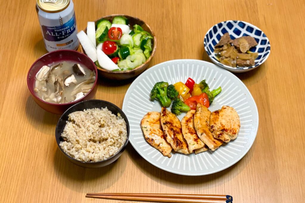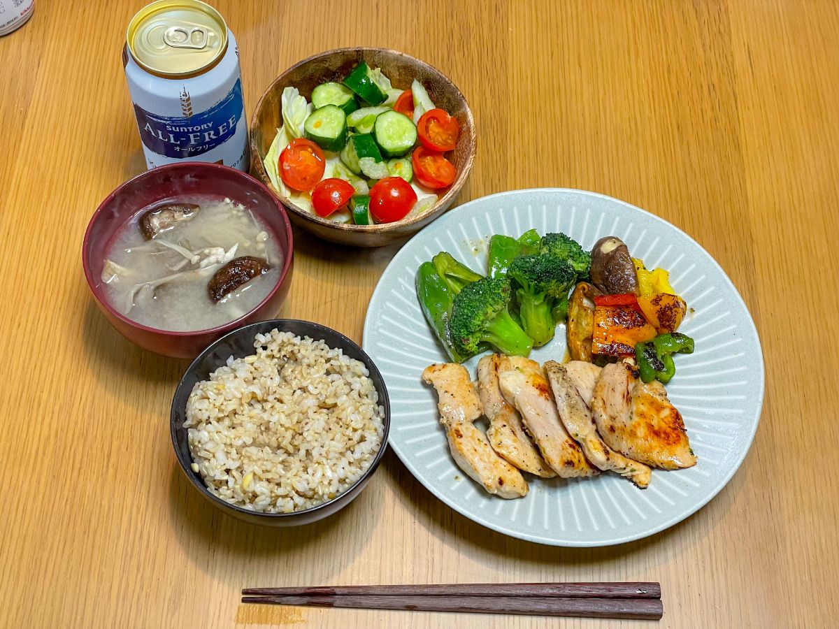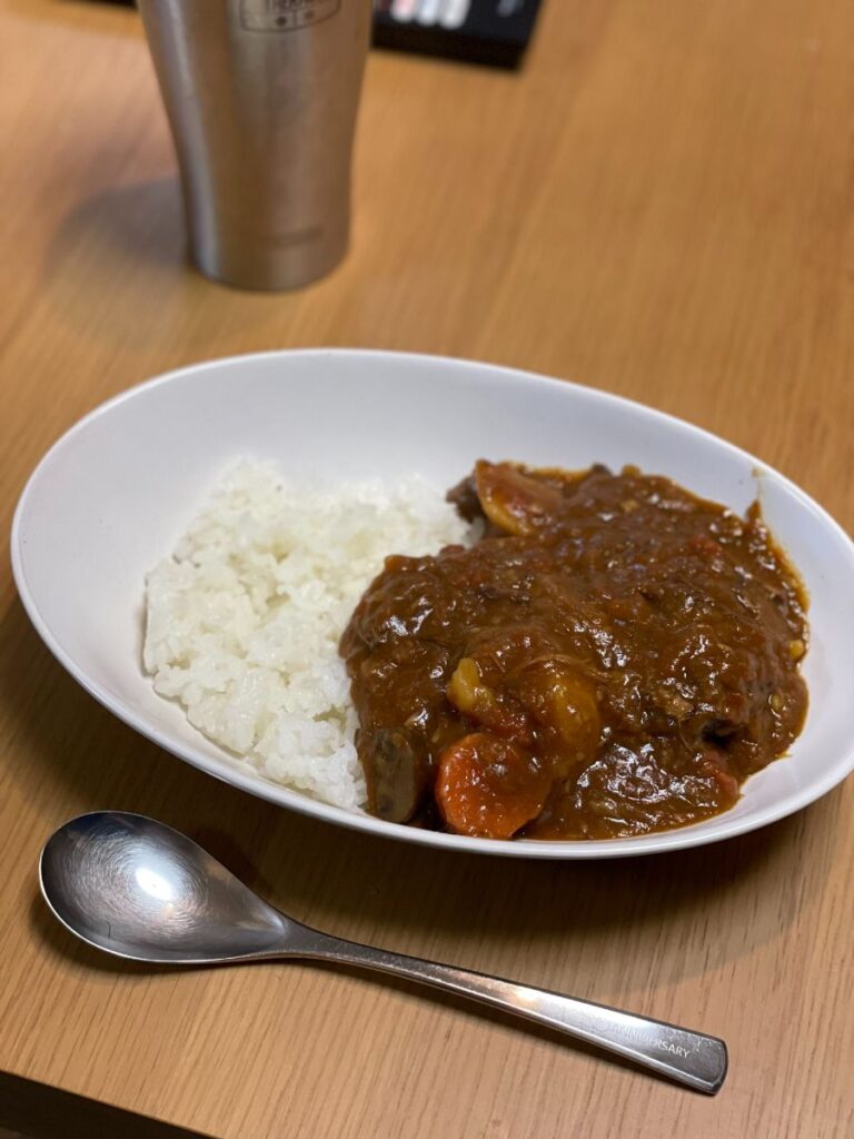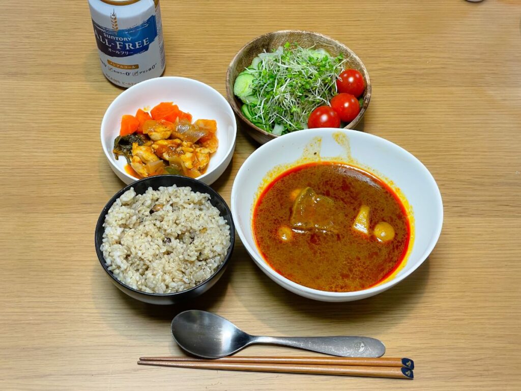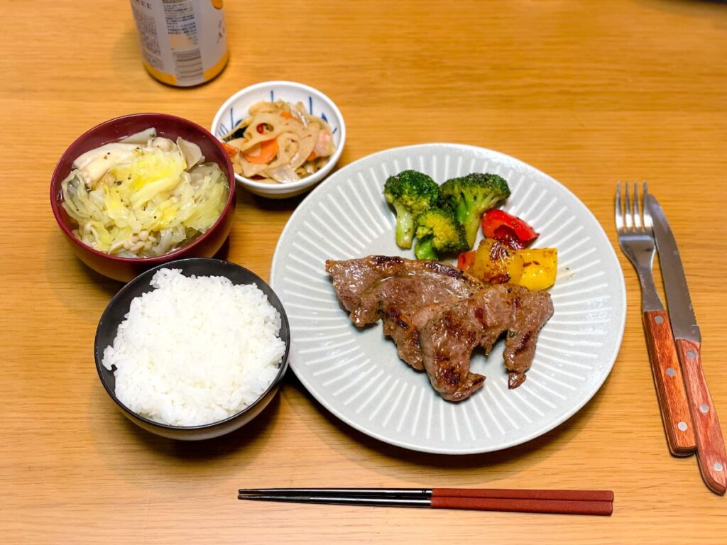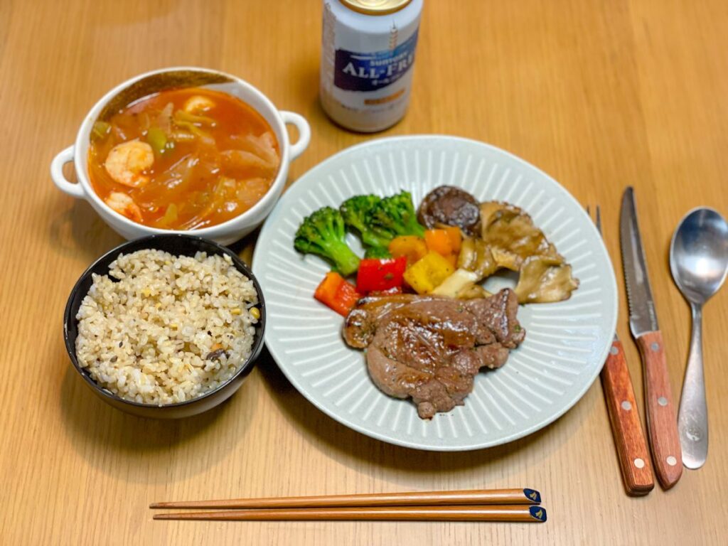 21:00 ラムステーキ、キャベツときのこのスープ、きんぴら、ご飯(2杯)