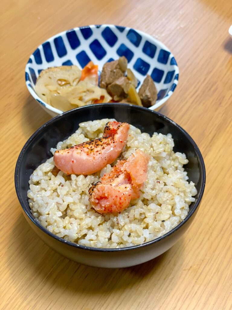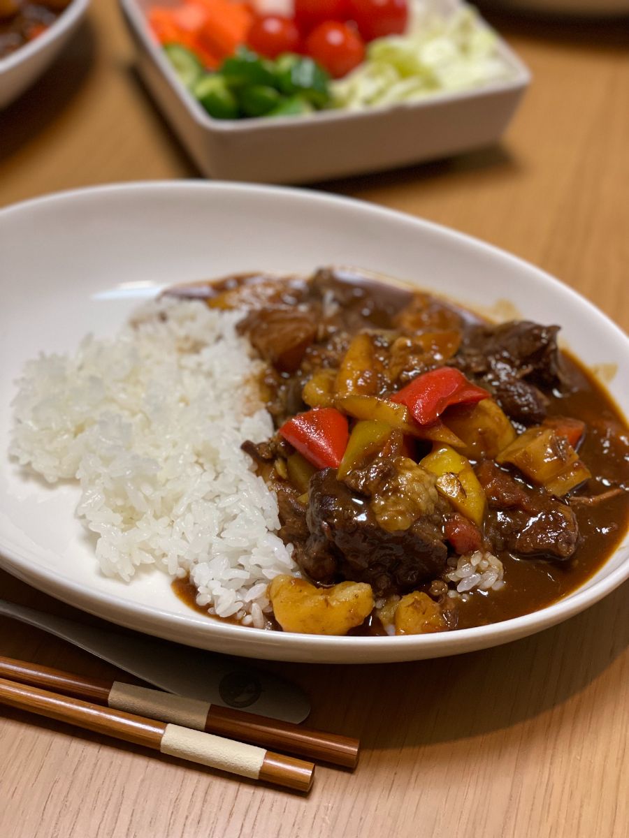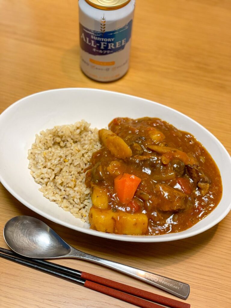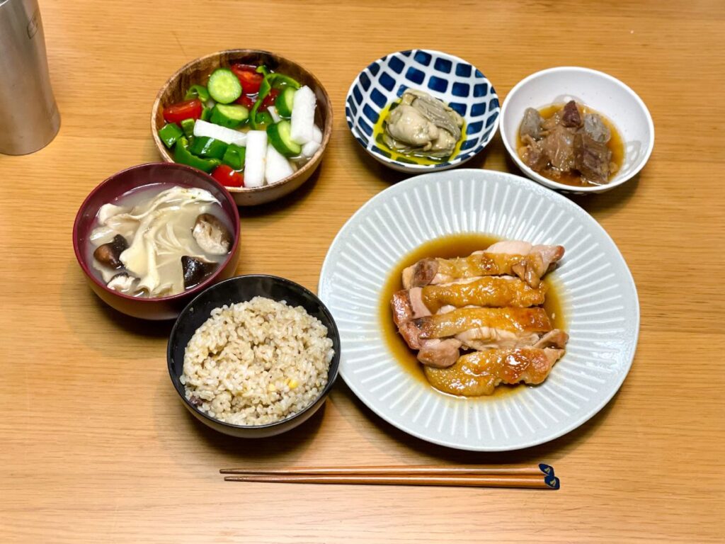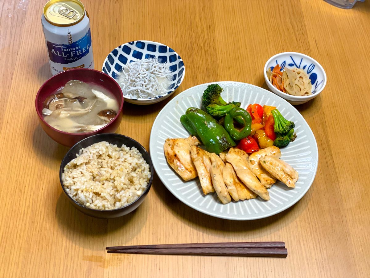 21:00 ラムステーキ、キャベツときのこのスープ、きんぴら、ご飯(2杯)