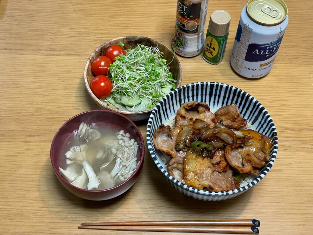 11:30 豚焼肉丼(脂身は除去)、サラダ、きのこの味噌汁