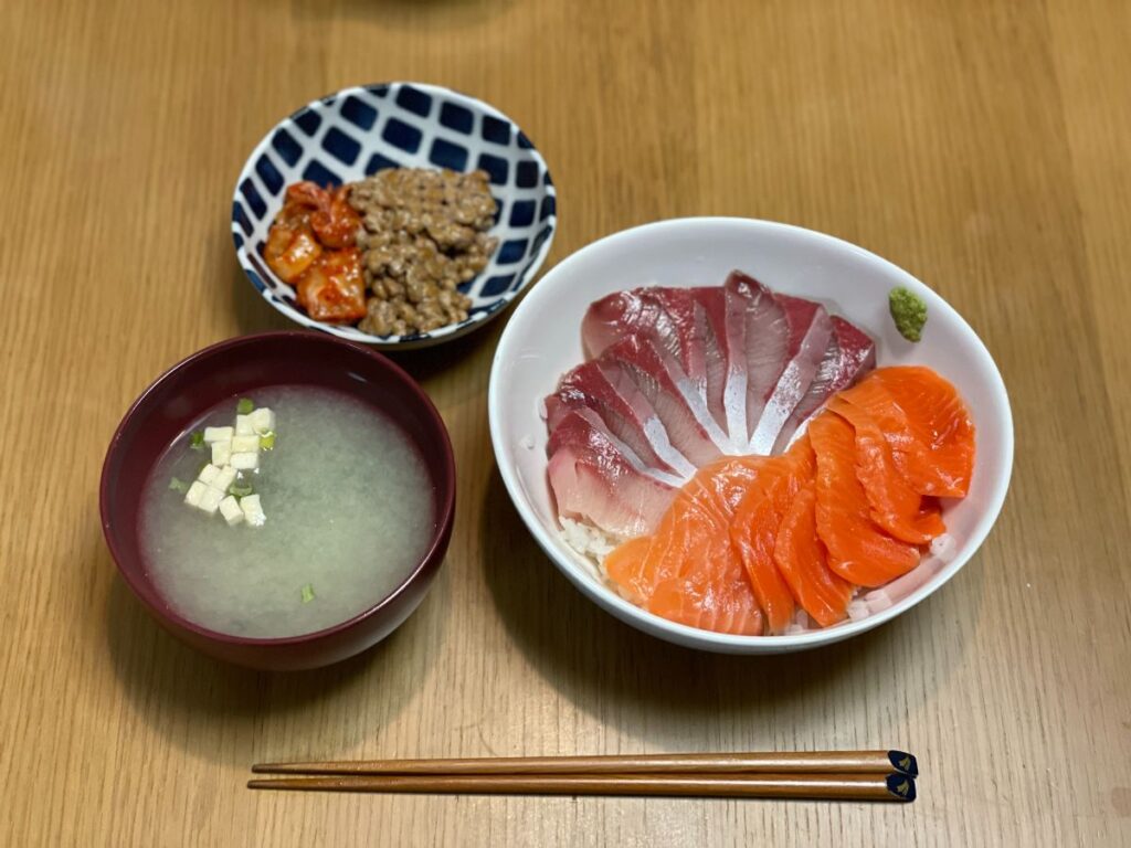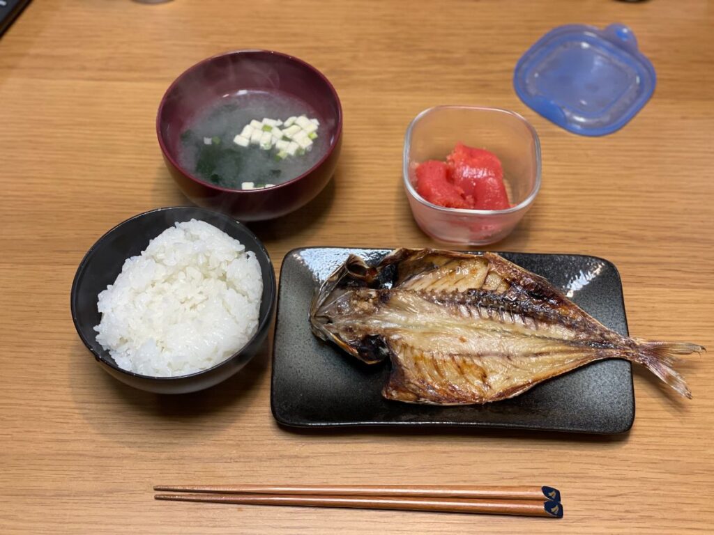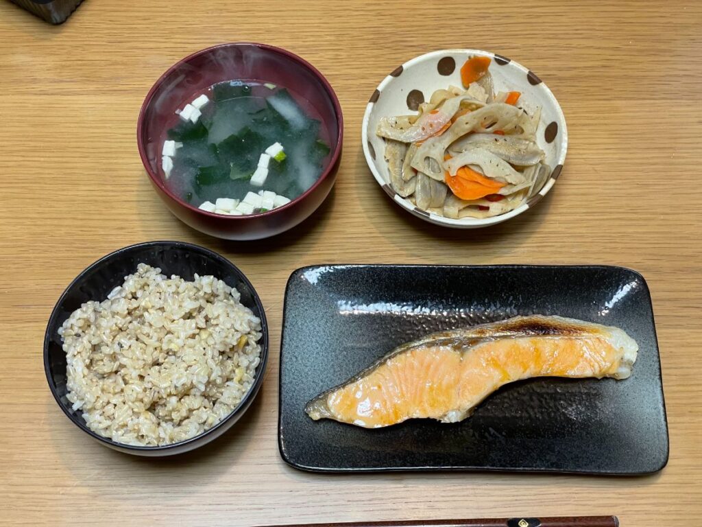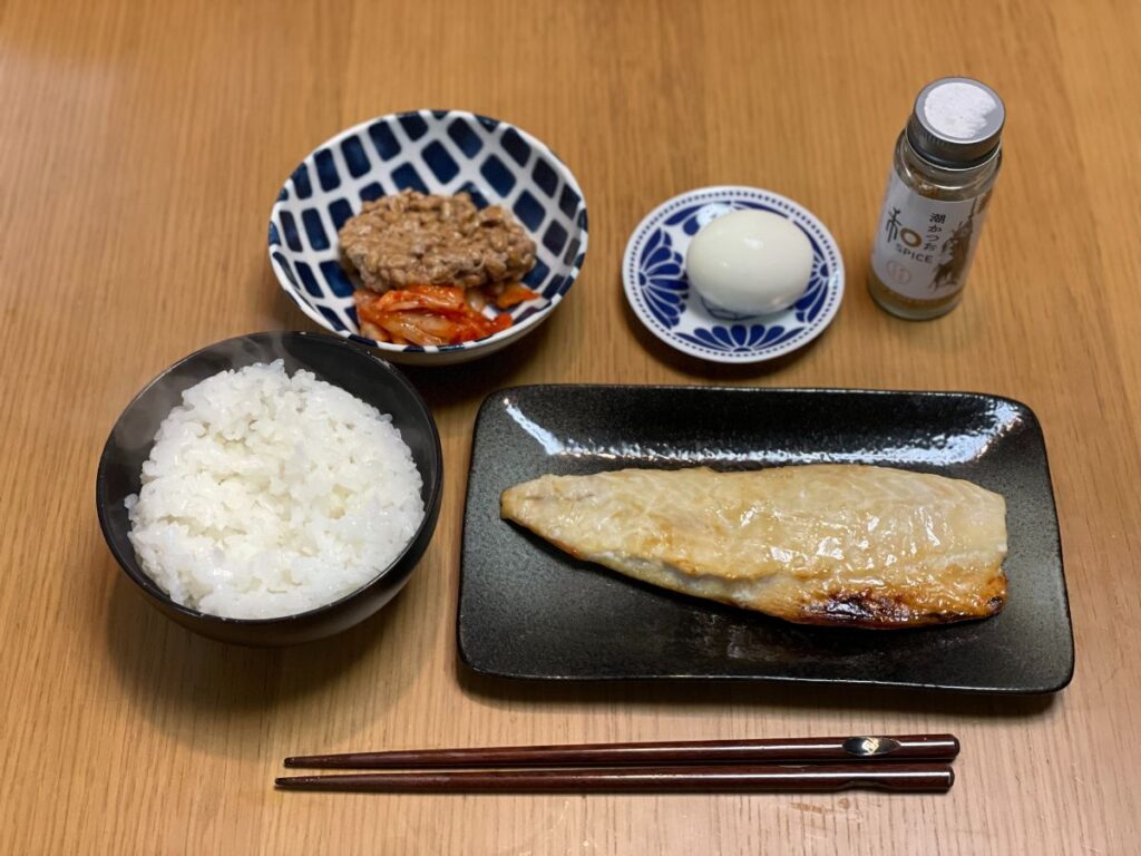 ・焼き魚、納豆、ゆで卵、サラダの構成とする。サラダドレッシングはノンオイルのものをベースに、えごま油を加える