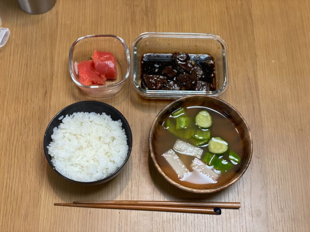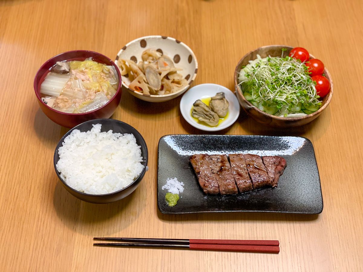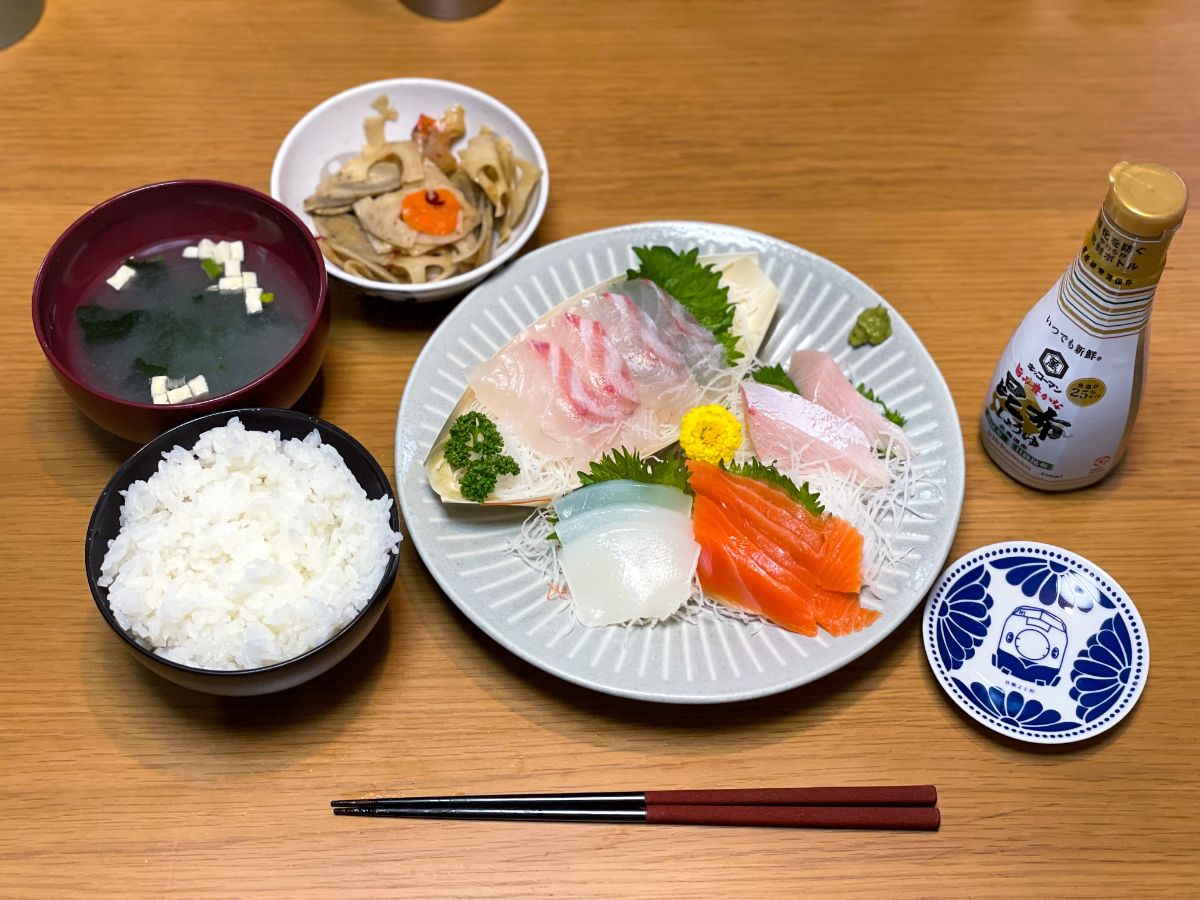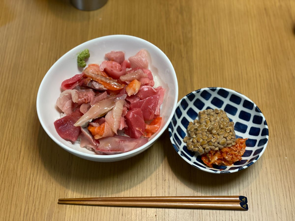 ・焼き魚、納豆、ゆで卵、サラダの構成とする。サラダドレッシングはノンオイルのものをベースに、えごま油を加える