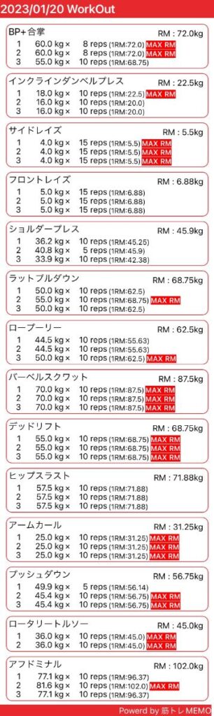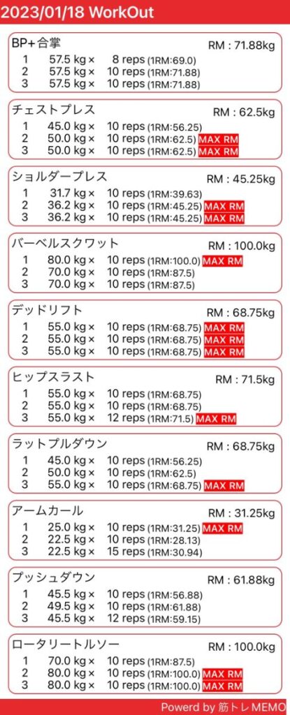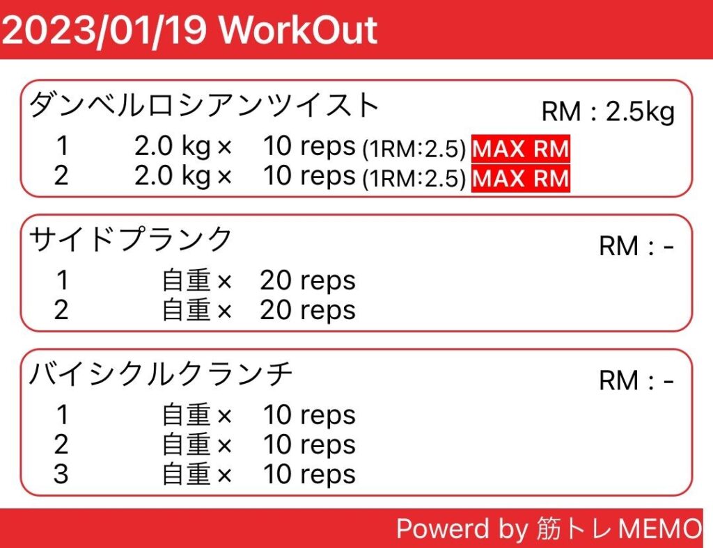 基本的に全身実施し、当面は肩・腹斜筋を多めに行う。