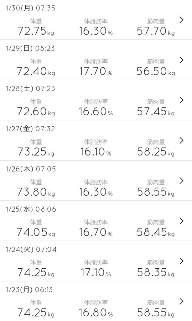 摂取カロリーが減ったこともあって、順調に体重は減少中。脂肪だけが減ってくれているといいんだけど。