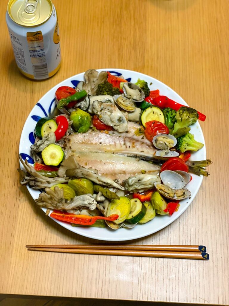 20:00 真鯛のカルパッチョサラダ、ローストビーフ(半額)、白菜とちじみほうれん草と豚肉のスープ