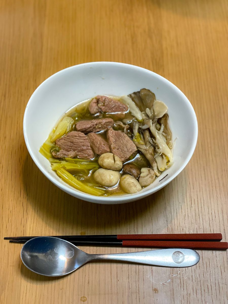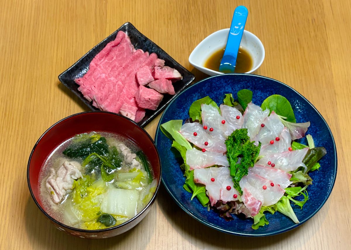 20:00 真鯛のカルパッチョサラダ、ローストビーフ(半額)、白菜とちじみほうれん草と豚肉のスープ