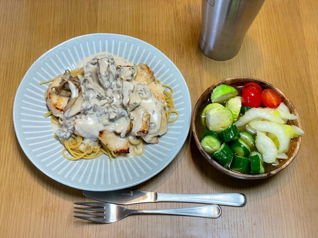 13:00 鶏むねときのこのクリームパスタ(ZENBヌードル)、ピクルス