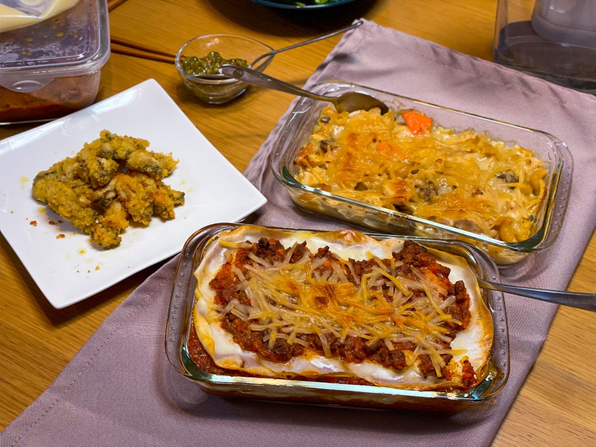 18:00 カキフライ、チキンマカロニグラタン、ラザニア、ベビーリーフ、フレンチトースト