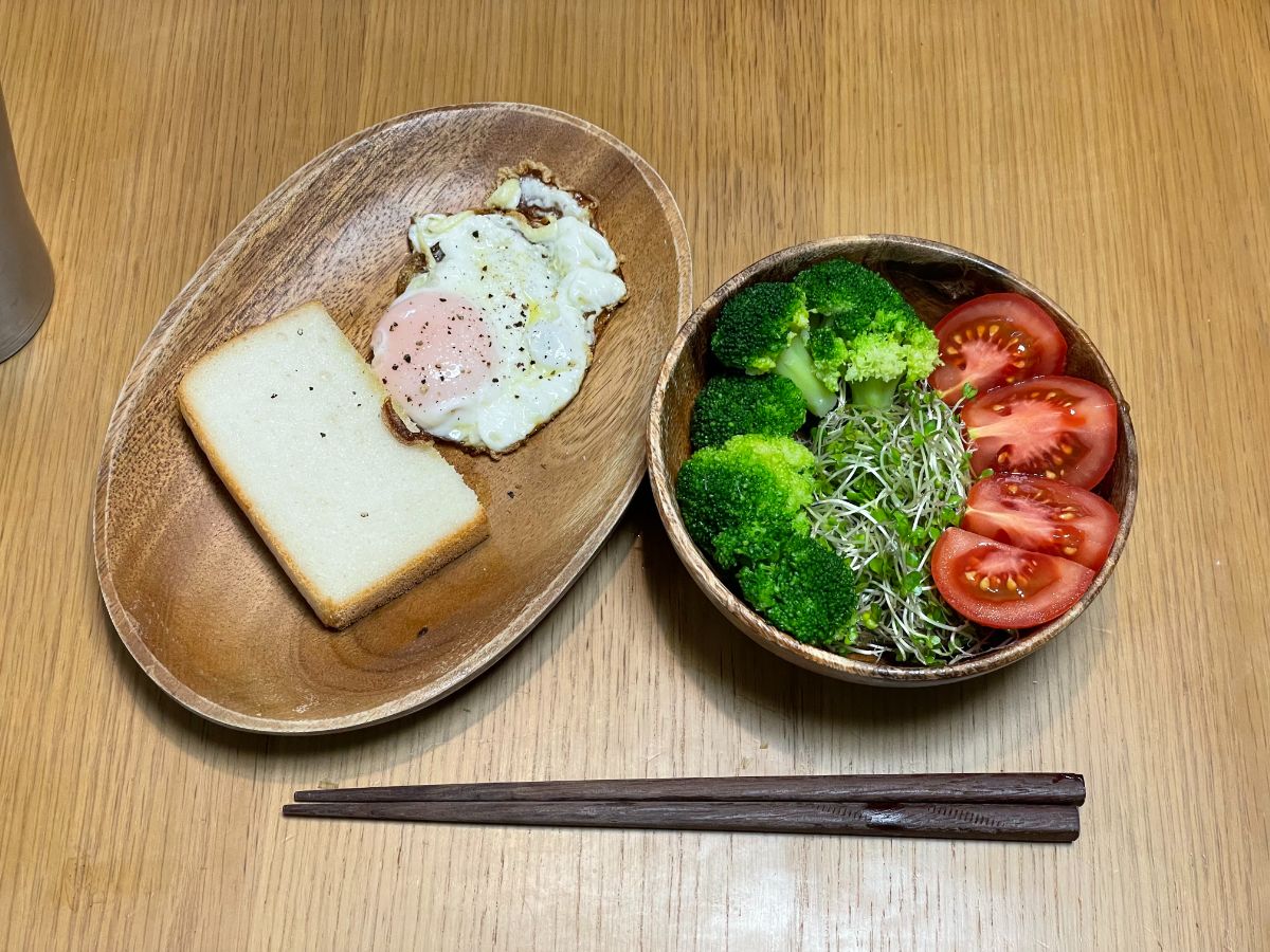 9:30 スムージー、米粉パン、目玉焼き、サラダ