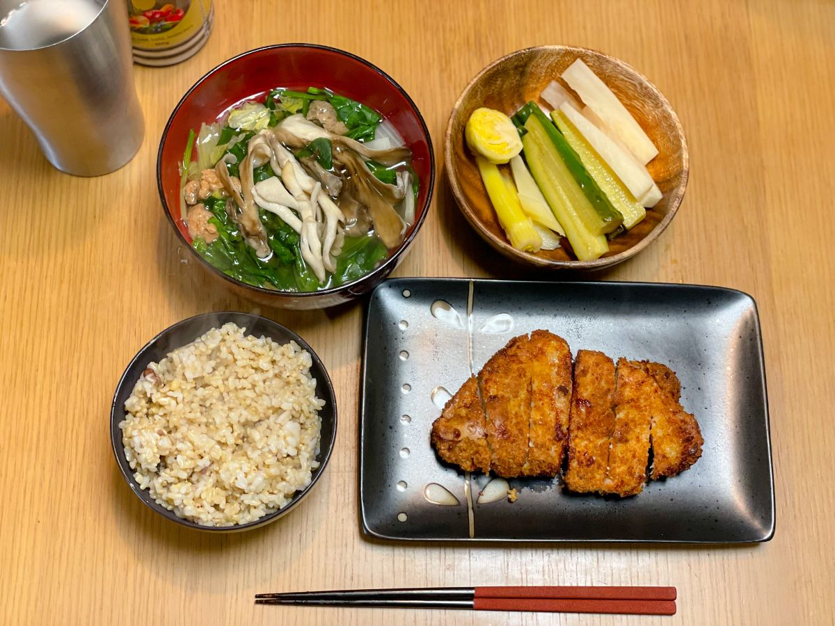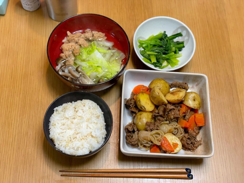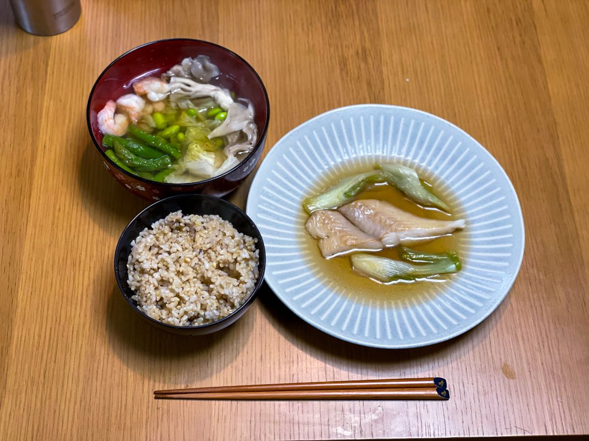 20:00 カレイの煮つけ、白菜とエビとアスパラガスのスープ、玄米ご飯