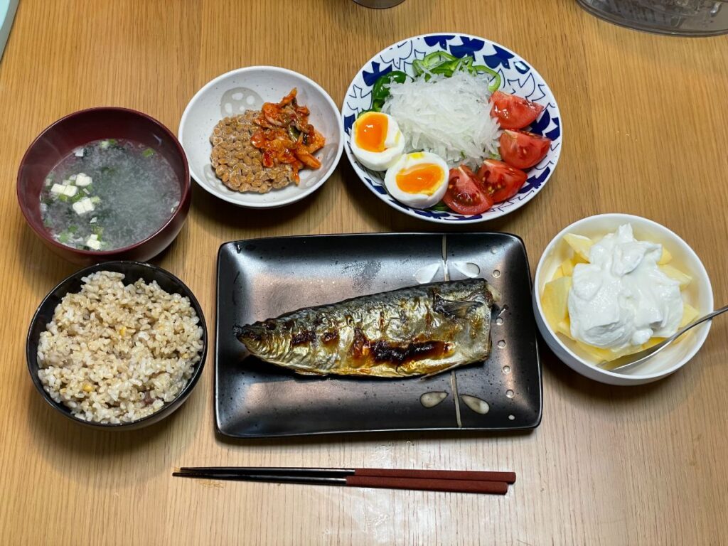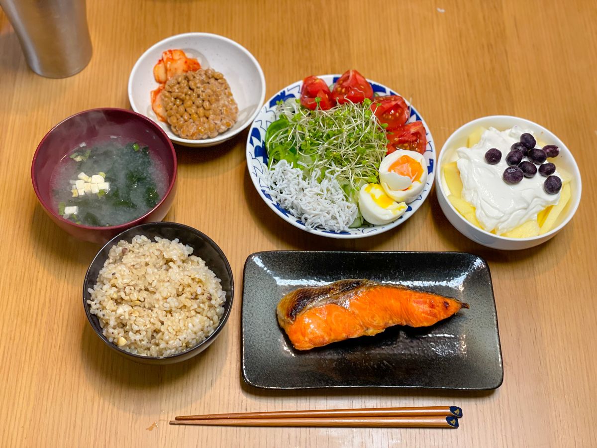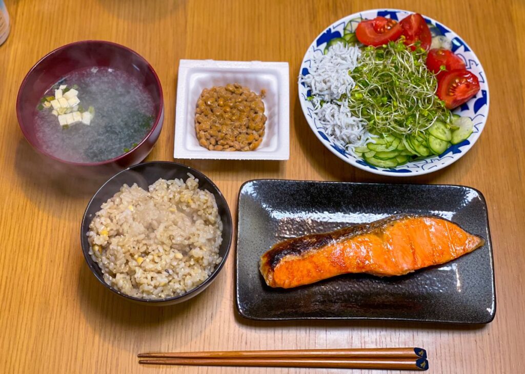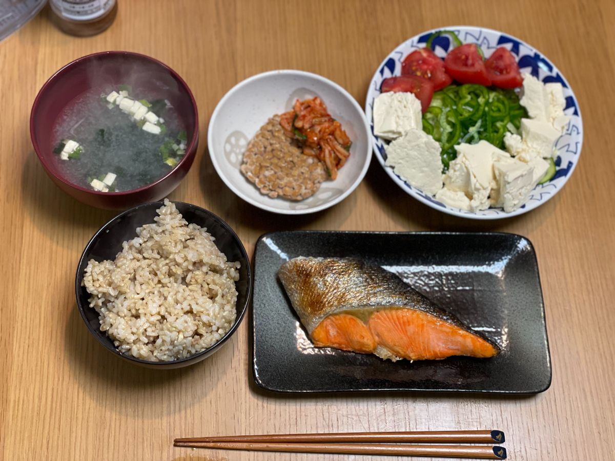 8:30 塩鮭、サラダ、もめん豆腐、納豆キムチ、味噌汁、玄米ご飯