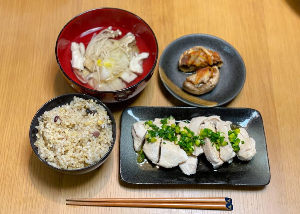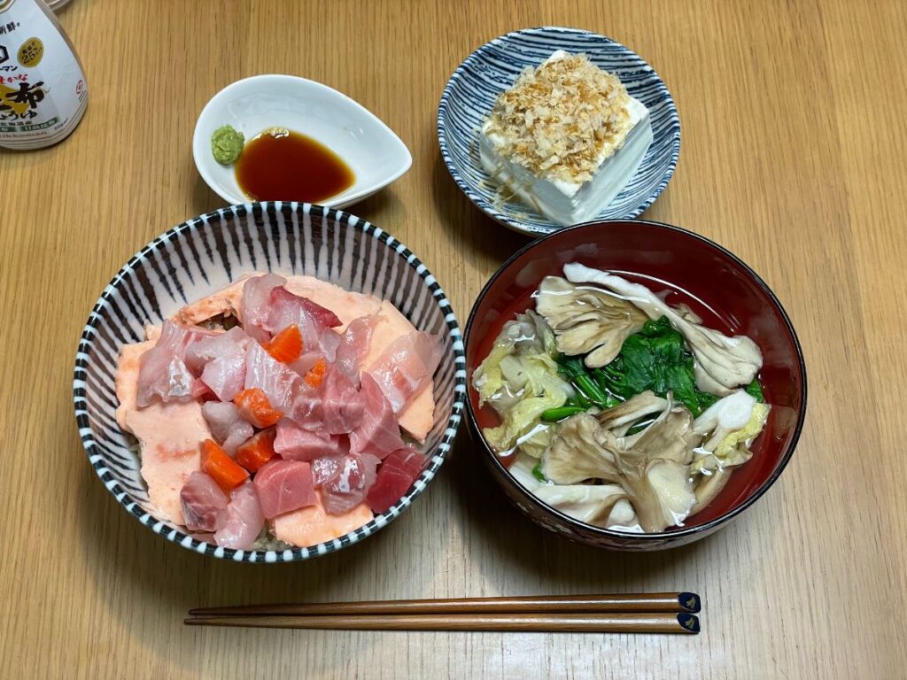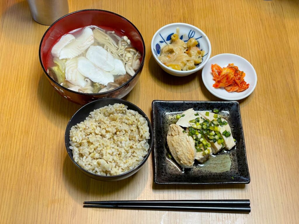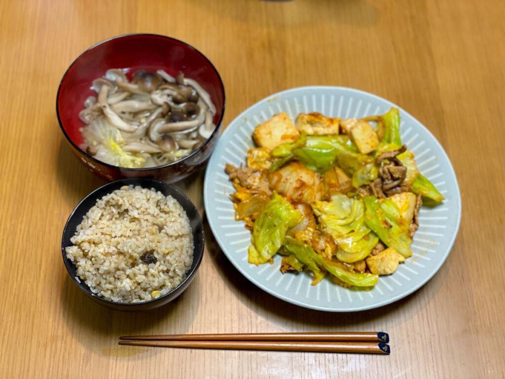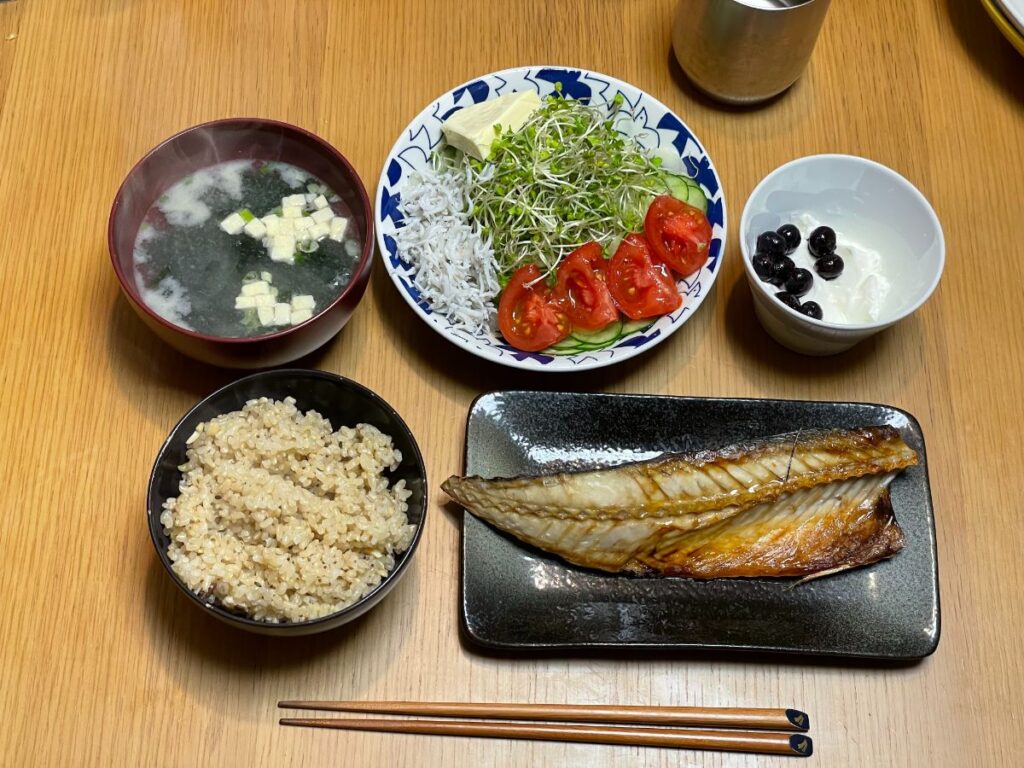 8:30 塩鮭、サラダ、もめん豆腐、納豆キムチ、味噌汁、玄米ご飯