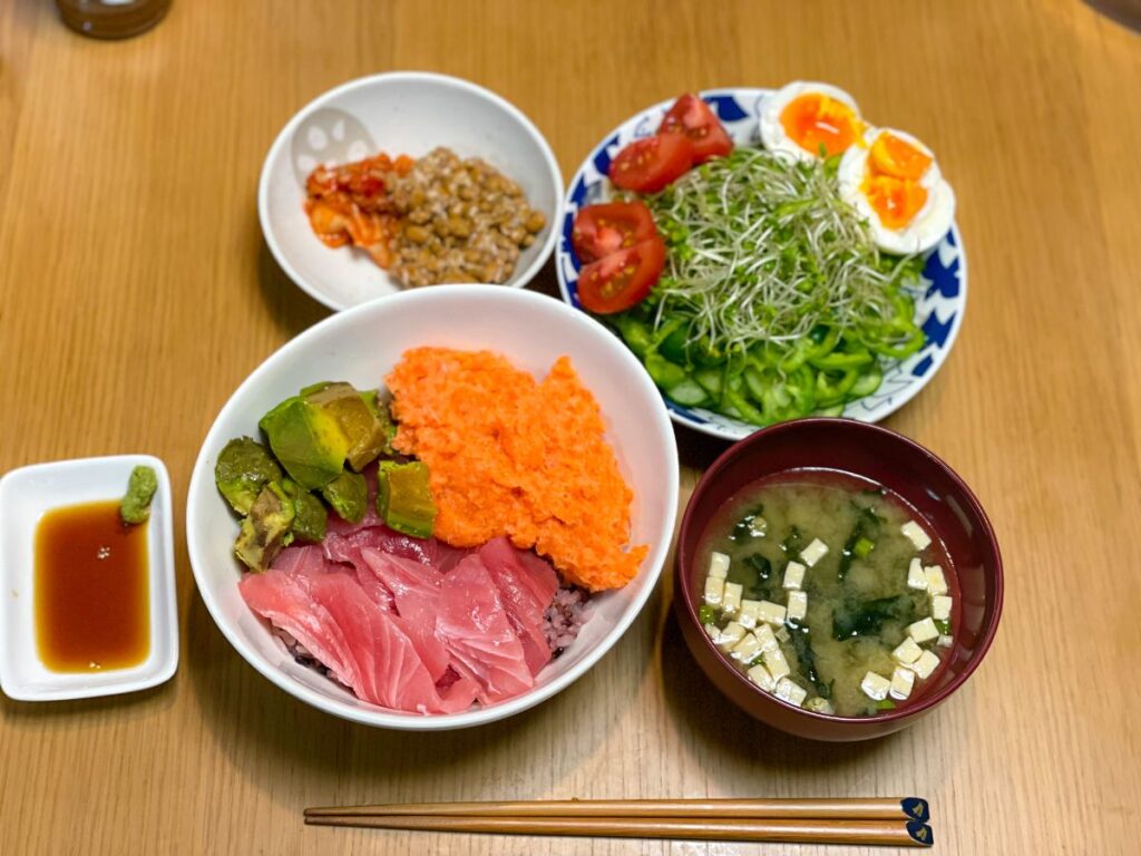 9:00 海鮮三色丼、納豆キムチ、サラダ、味噌汁