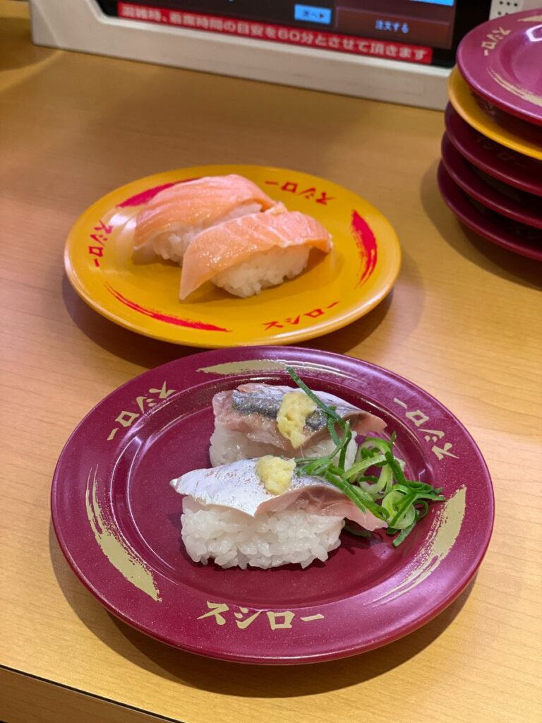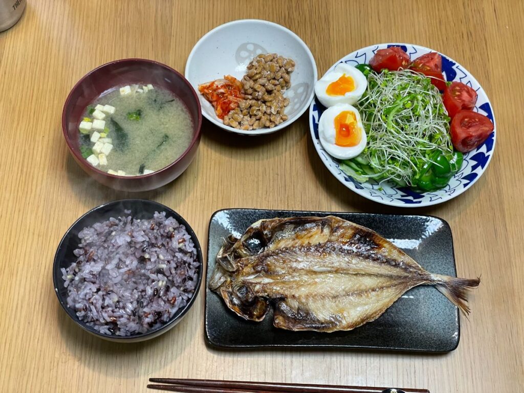 9:00 アジの開き、サラダ、ゆで卵、納豆キムチ、味噌汁、古代米ご飯