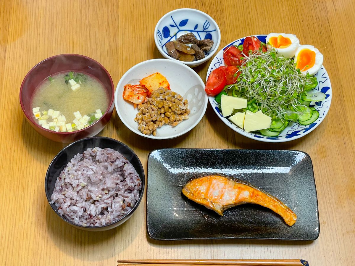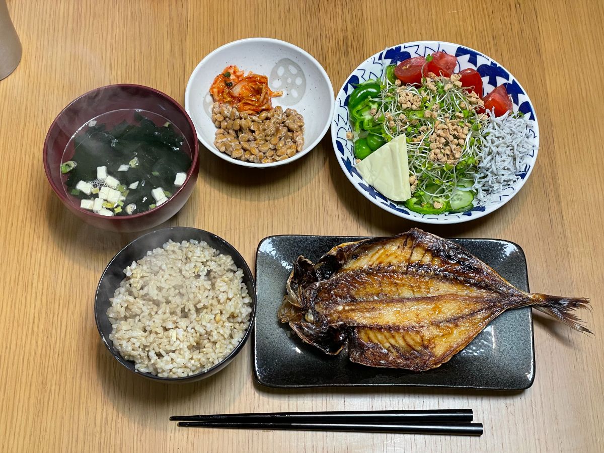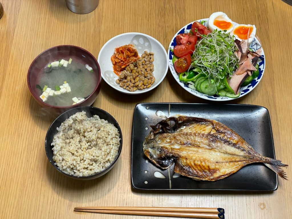 9:00 アジの開き、サラダ、ゆで卵、納豆キムチ、味噌汁、古代米ご飯