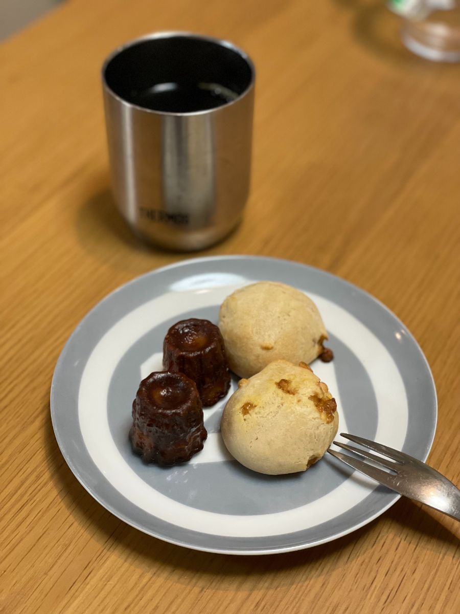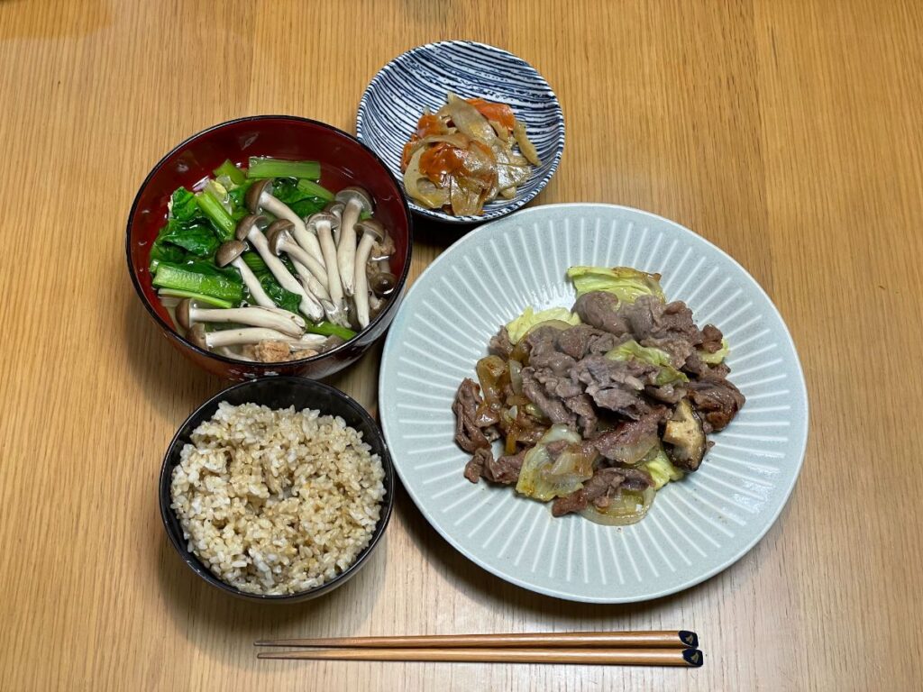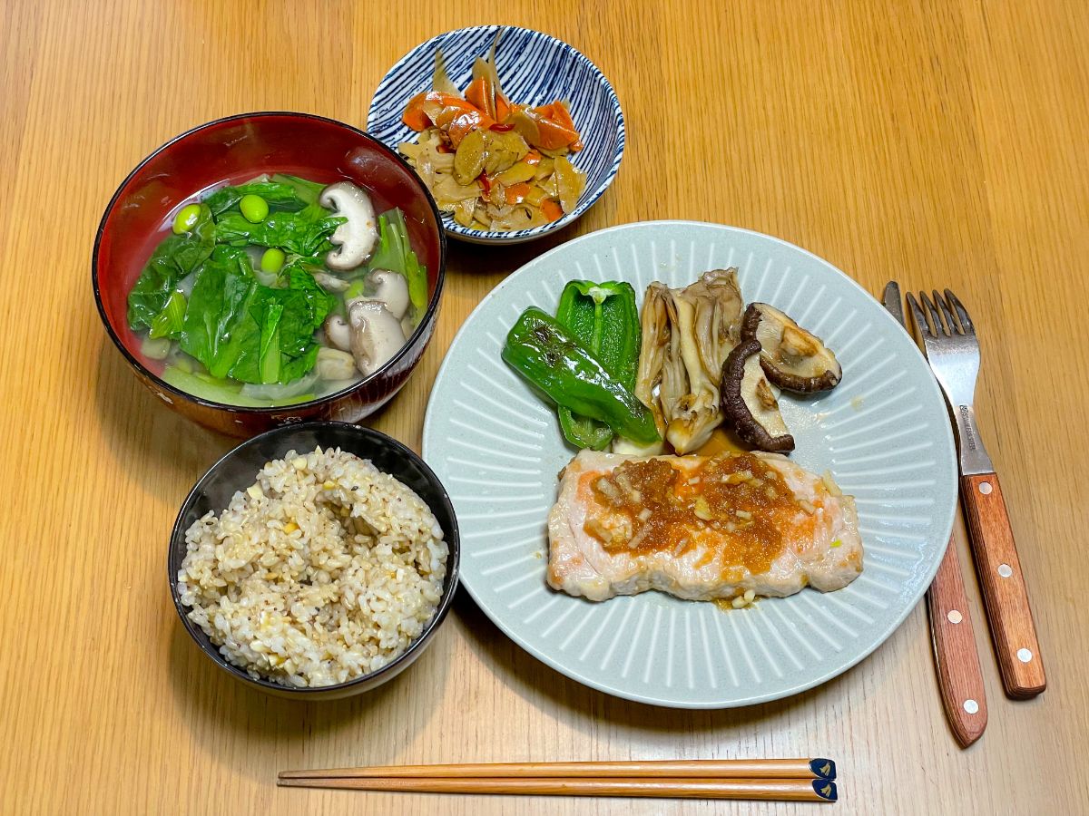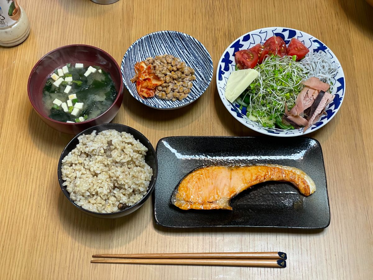 9:00 アジの開き、サラダ、ゆで卵、納豆キムチ、味噌汁、古代米ご飯