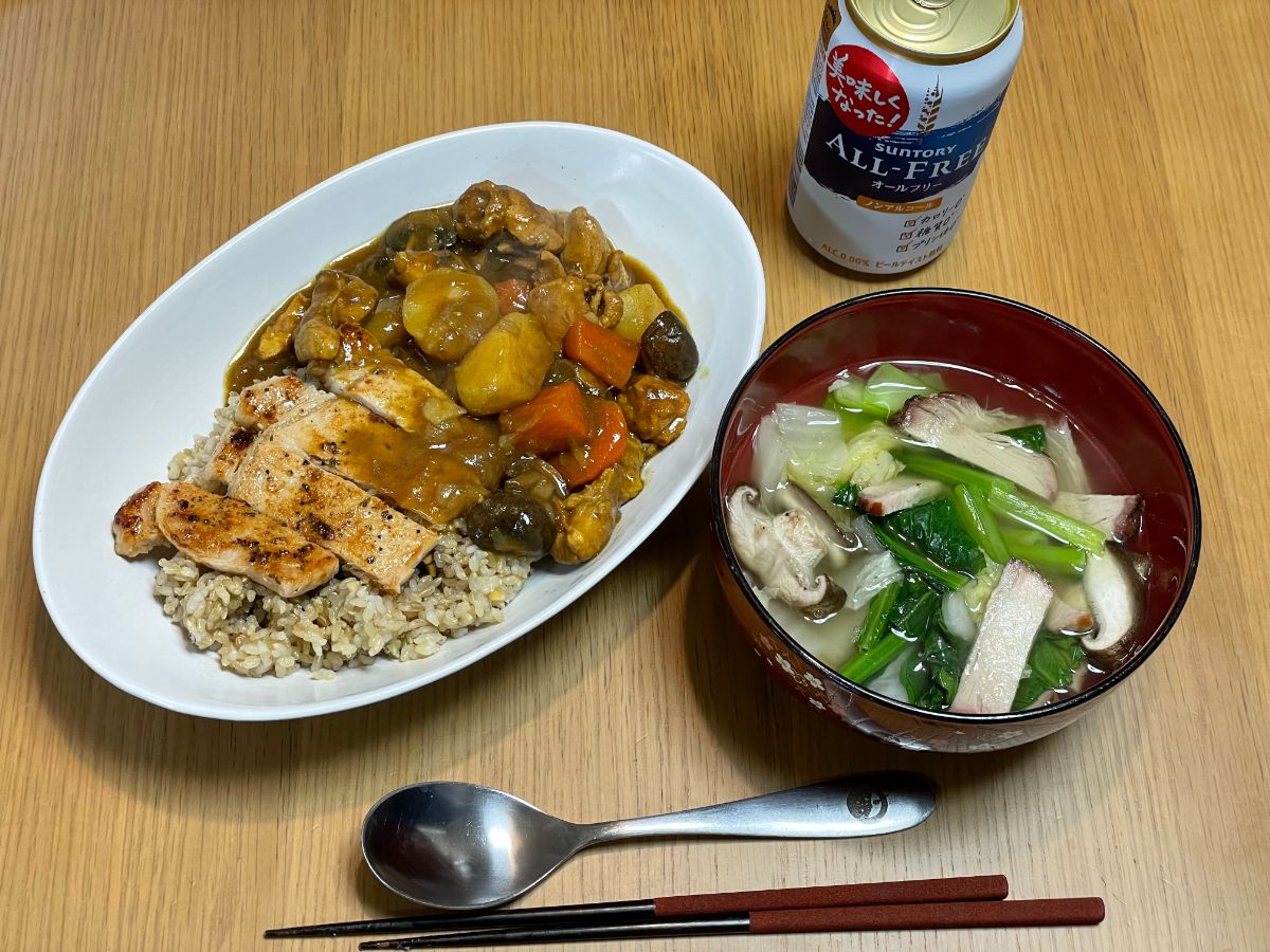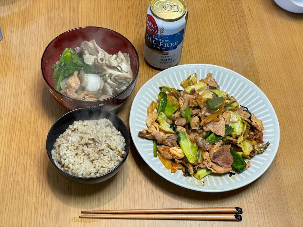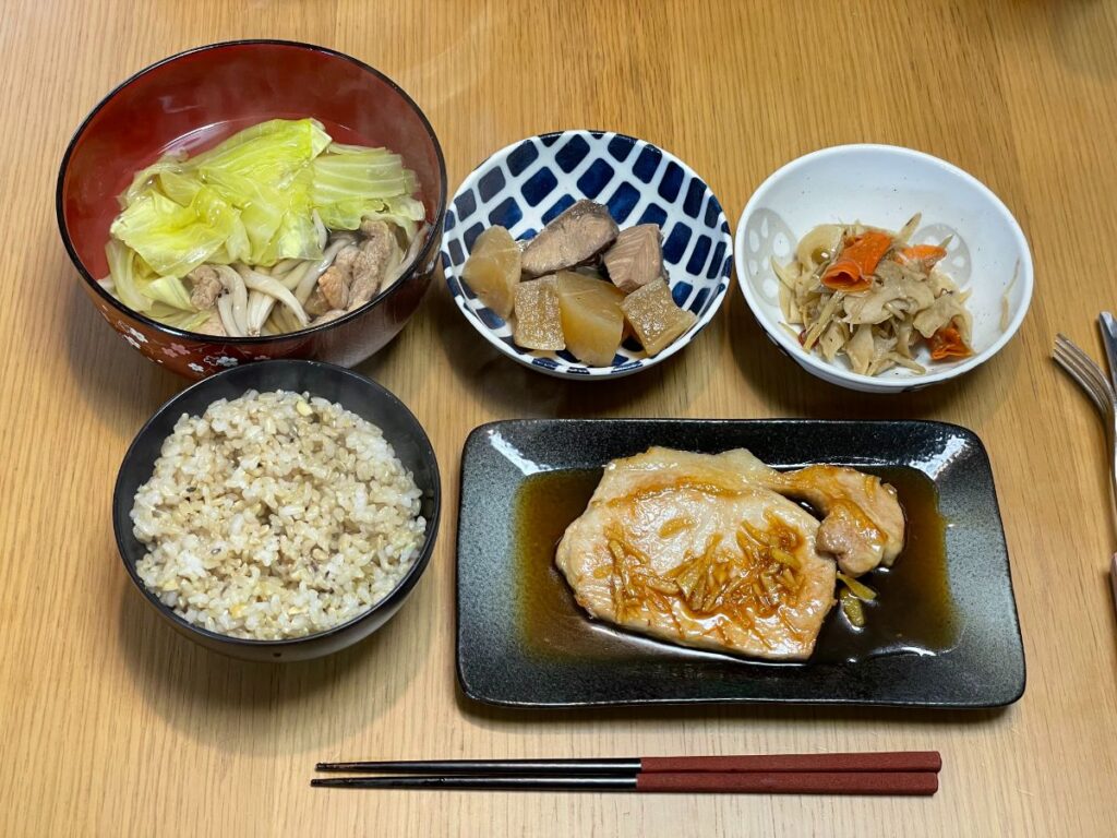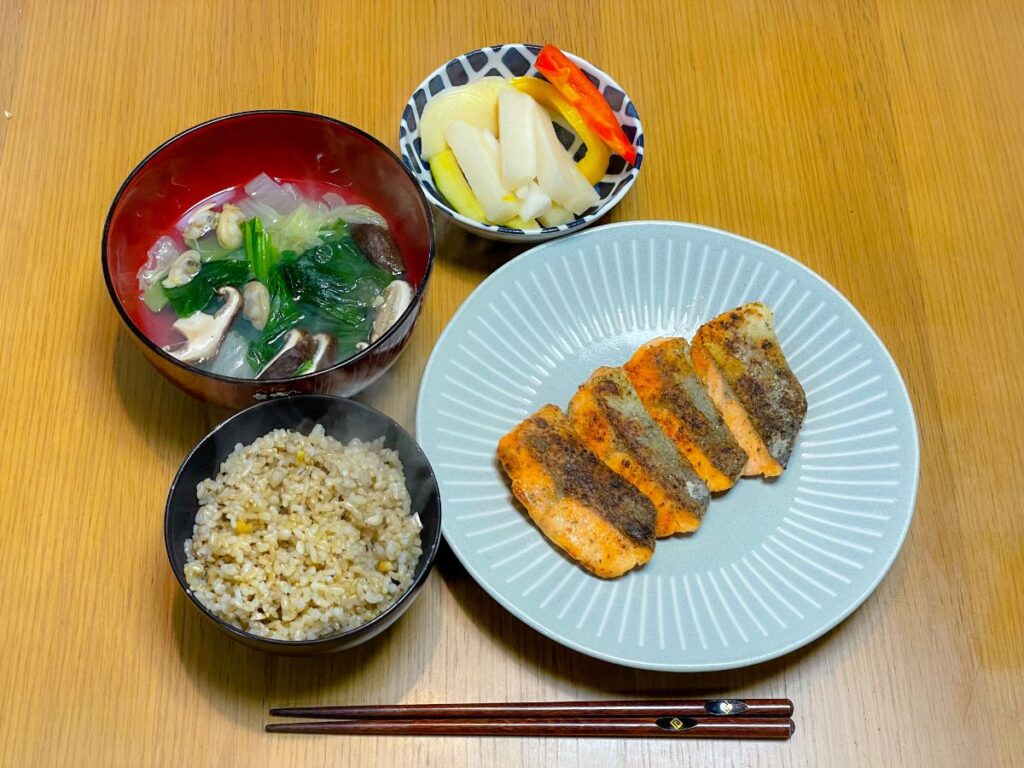21:00 玄米ご飯、鮭香草焼き、白菜と小松菜の吸い物