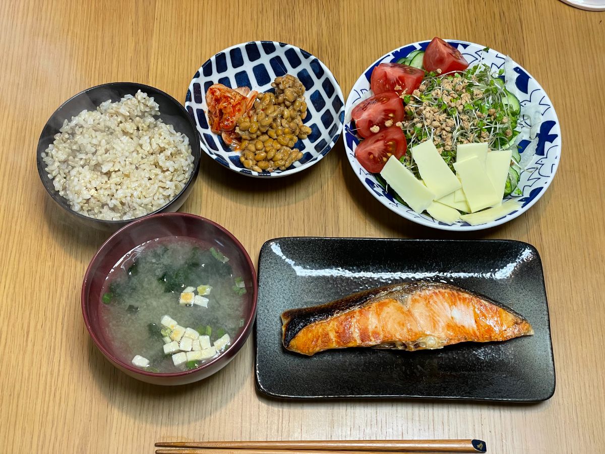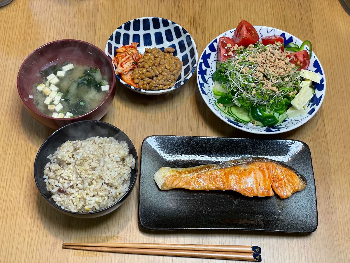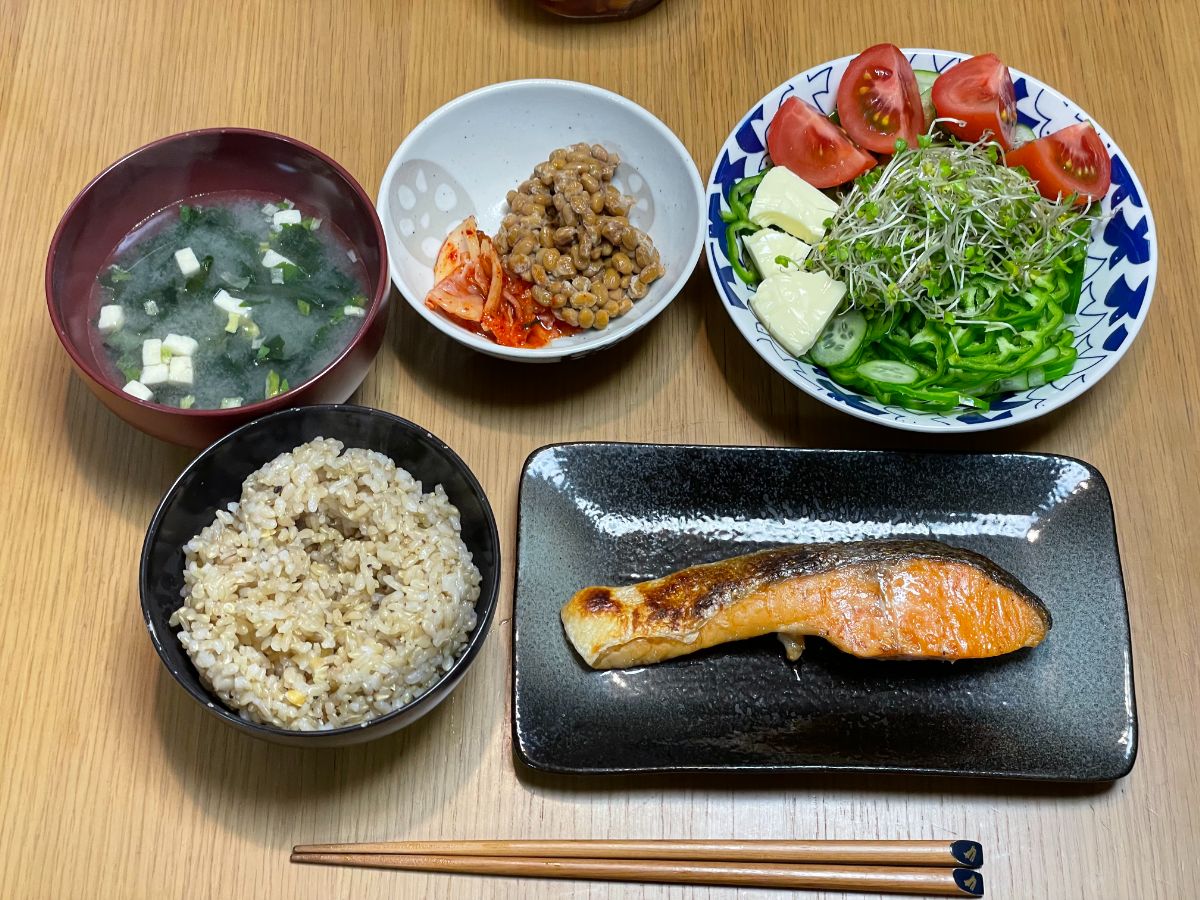 9:00 塩鮭、サラダ、納豆キムチ、味噌汁、玄米ご飯