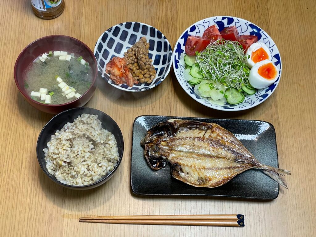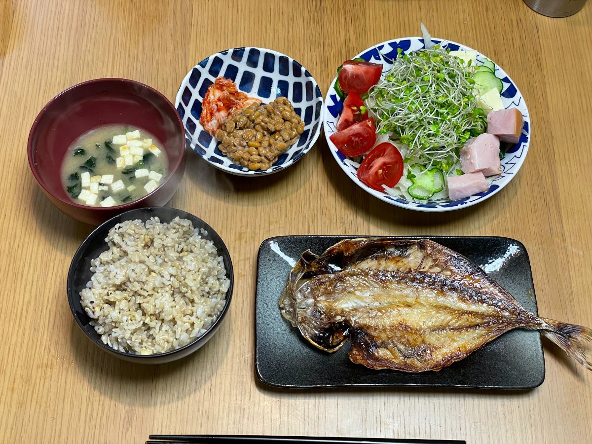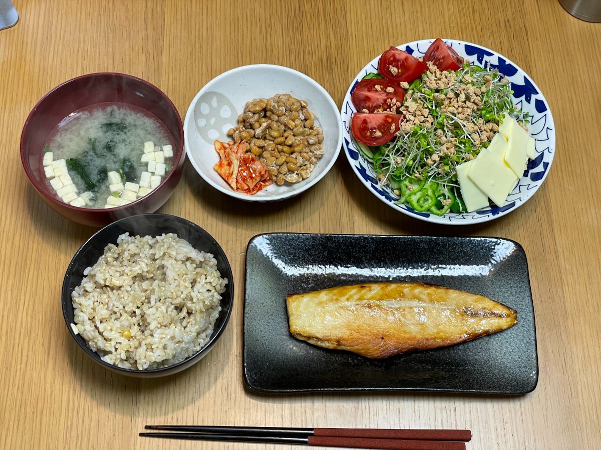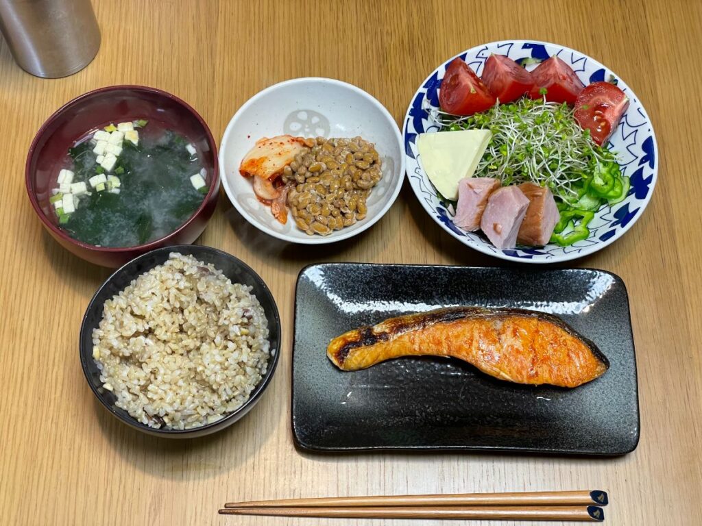 9:00 塩鮭、サラダ、納豆キムチ、味噌汁、玄米ご飯