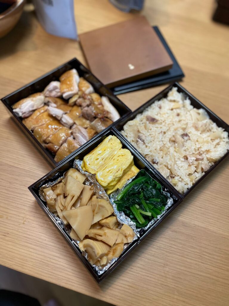 13:00 鶏とたけのこご飯、鶏の照焼、筍土佐煮、だし巻き卵、ほうれん草おひたし、フライドポテト、ポテトチップス