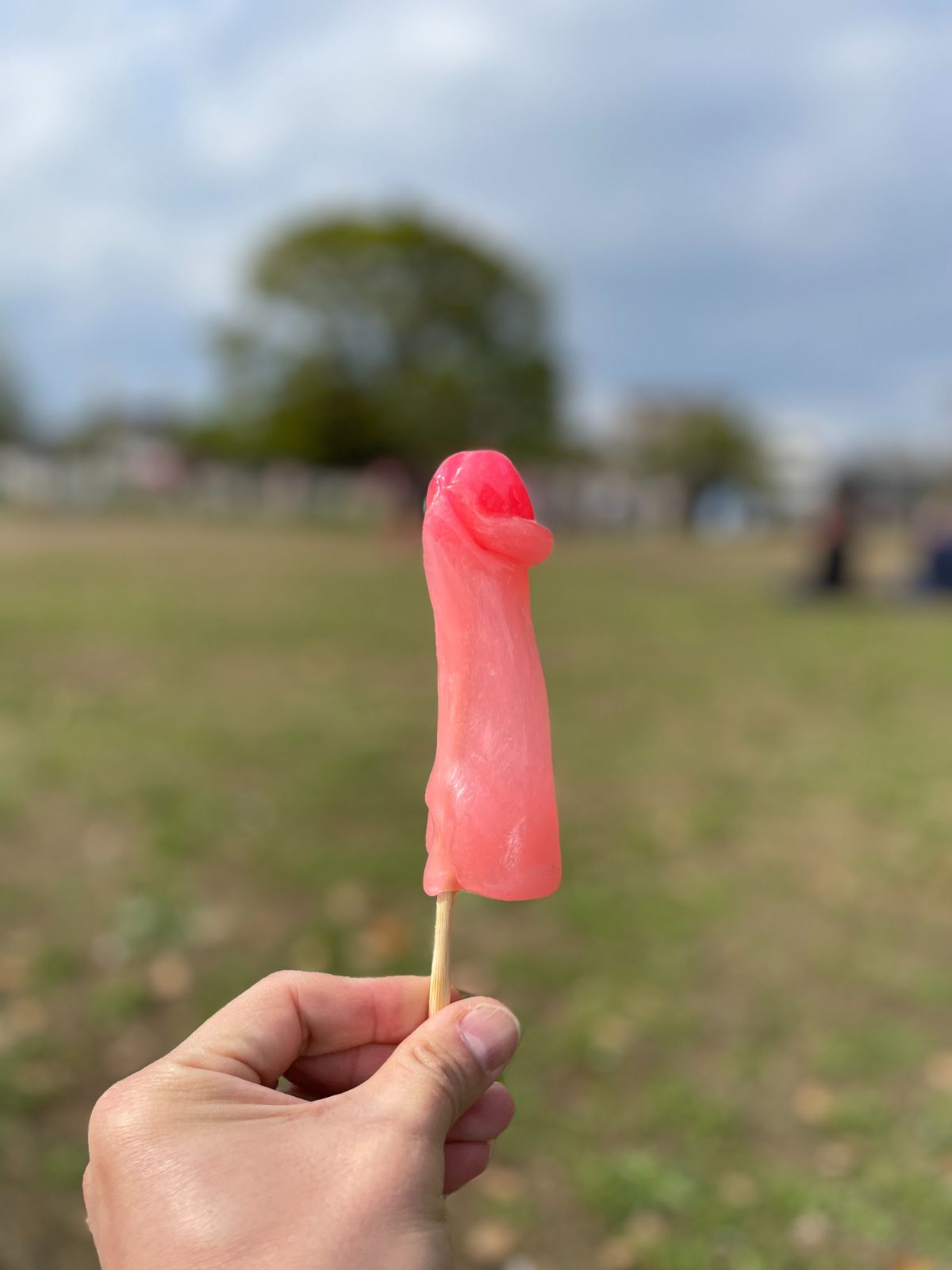 見物に訪れた大量の外国人が、すごい形状の飴を口にして楽しそうにしていました笑