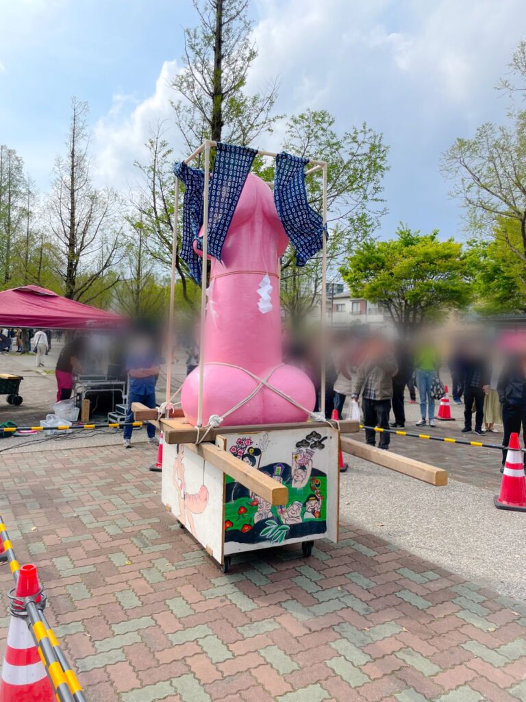 お花見してたら、ちょうどお祭り(日本の奇祭の一つ、かなまら祭り)開催中。これ、お神輿です笑 アホな祭りすぎて世界的にも有名。川崎駅あたりからわらわらと外国人観光客がいて大混雑。