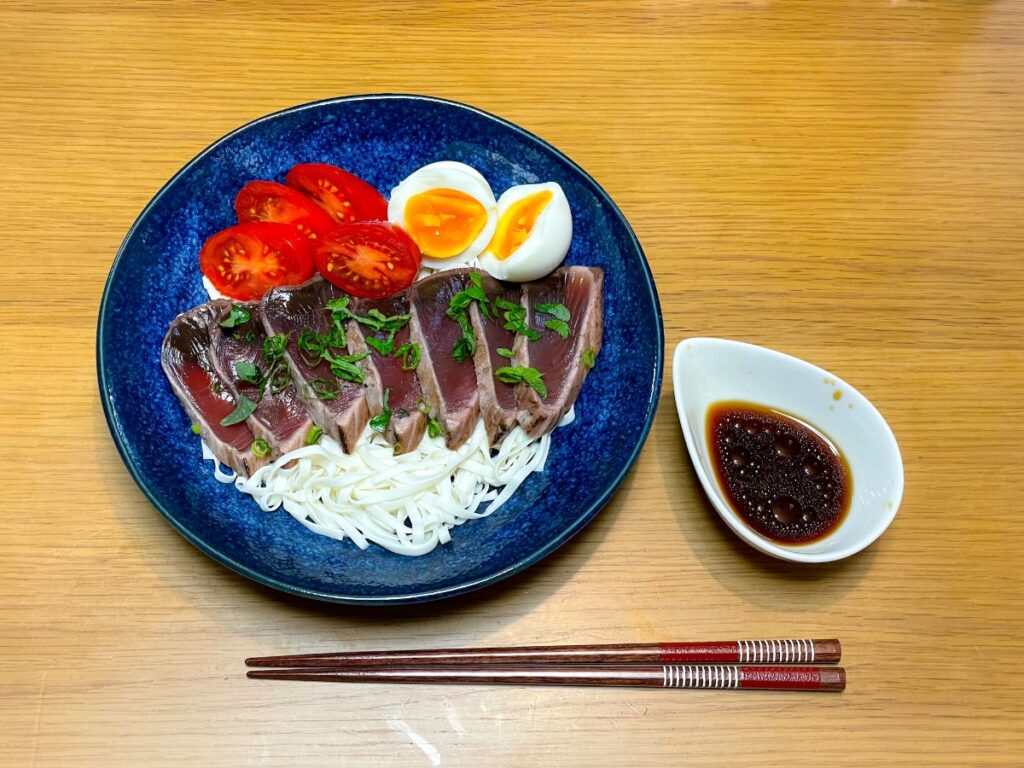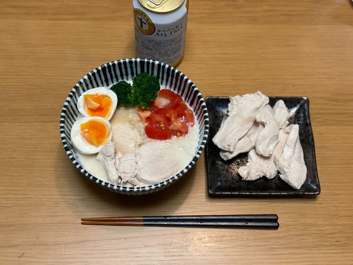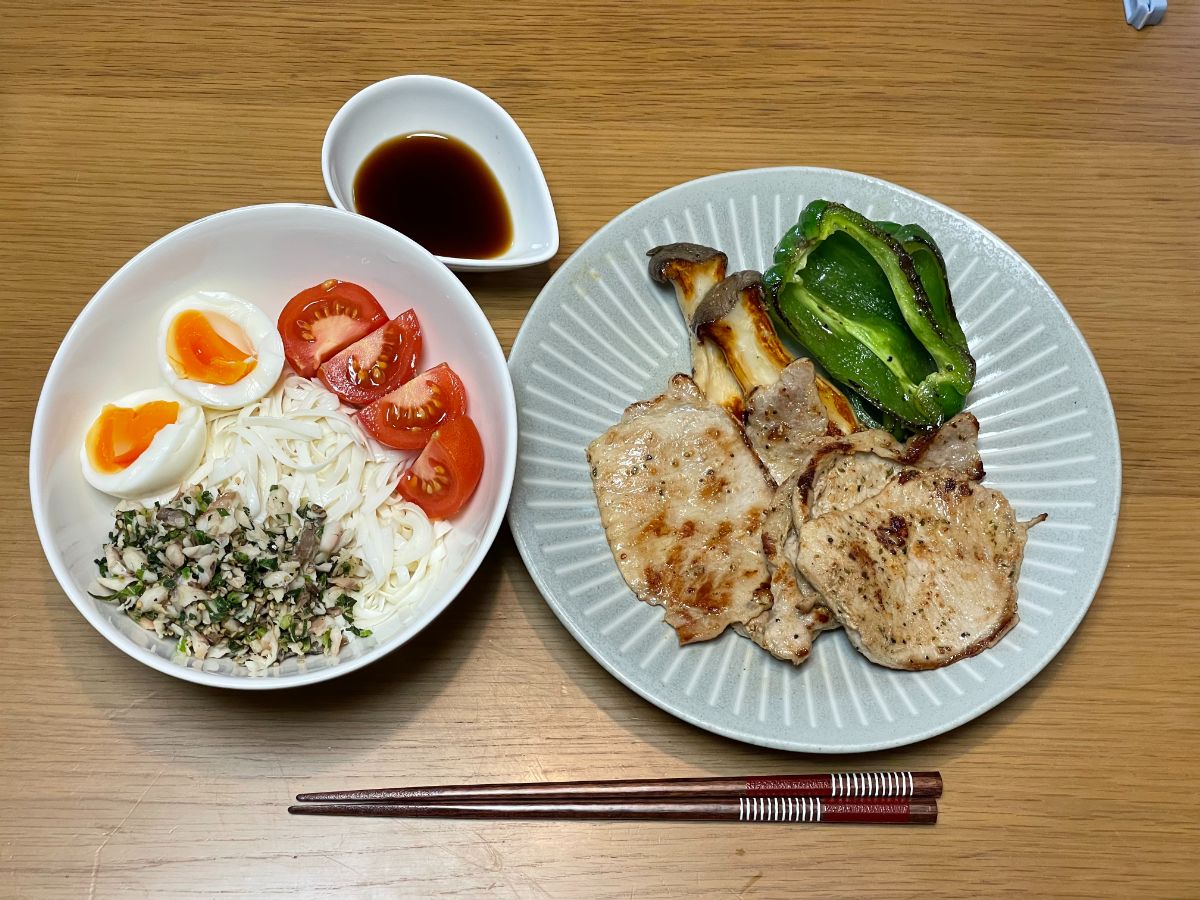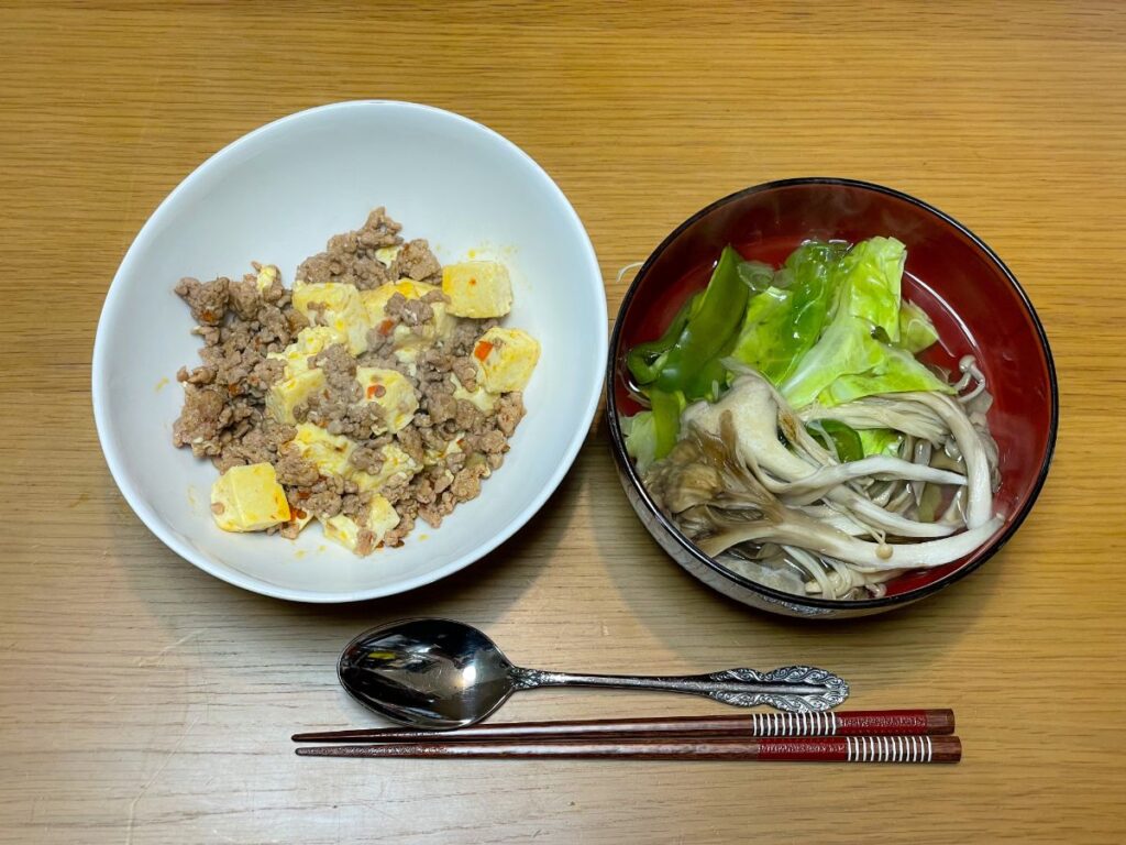 21:00 鶏団子トマト豆腐麺、ピーマンの鰤フレークあえ