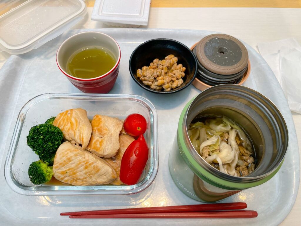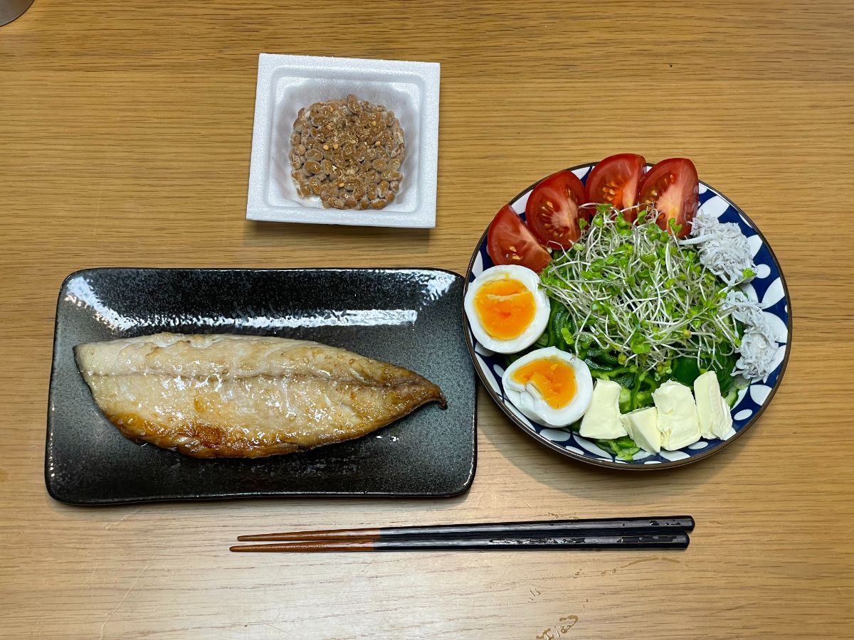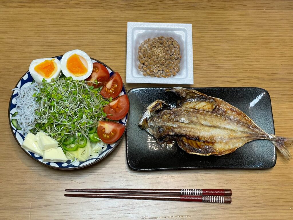 8:45 プロテインスムージー、サラダ、ゆで卵、納豆、鯵ひらき