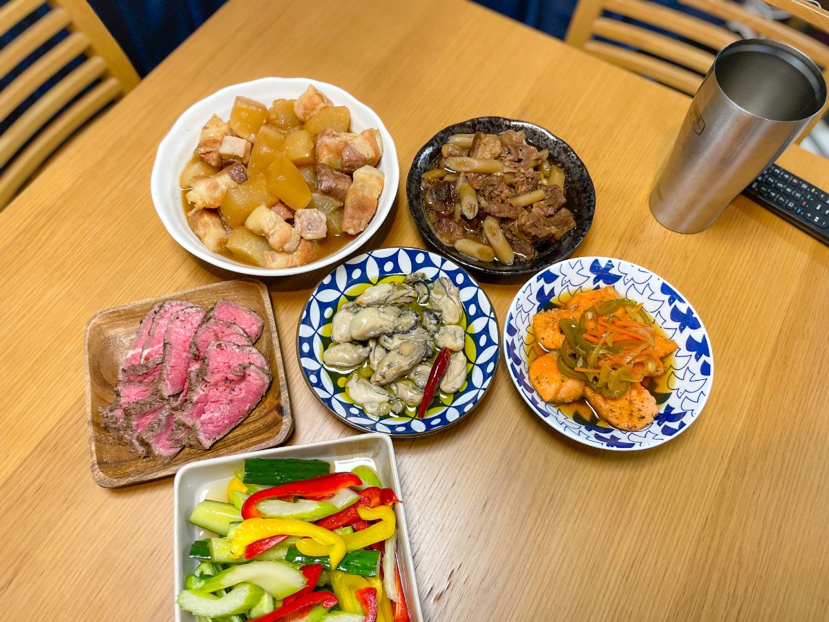 調味料は全て糖質0のもの。角煮大根は大根は食べてない。牛すじごぼうもごぼうは食べていない。ピクルスもパプリカは食べていない。唐揚げは3つくらい食べた。牡蠣は2粒くらい。