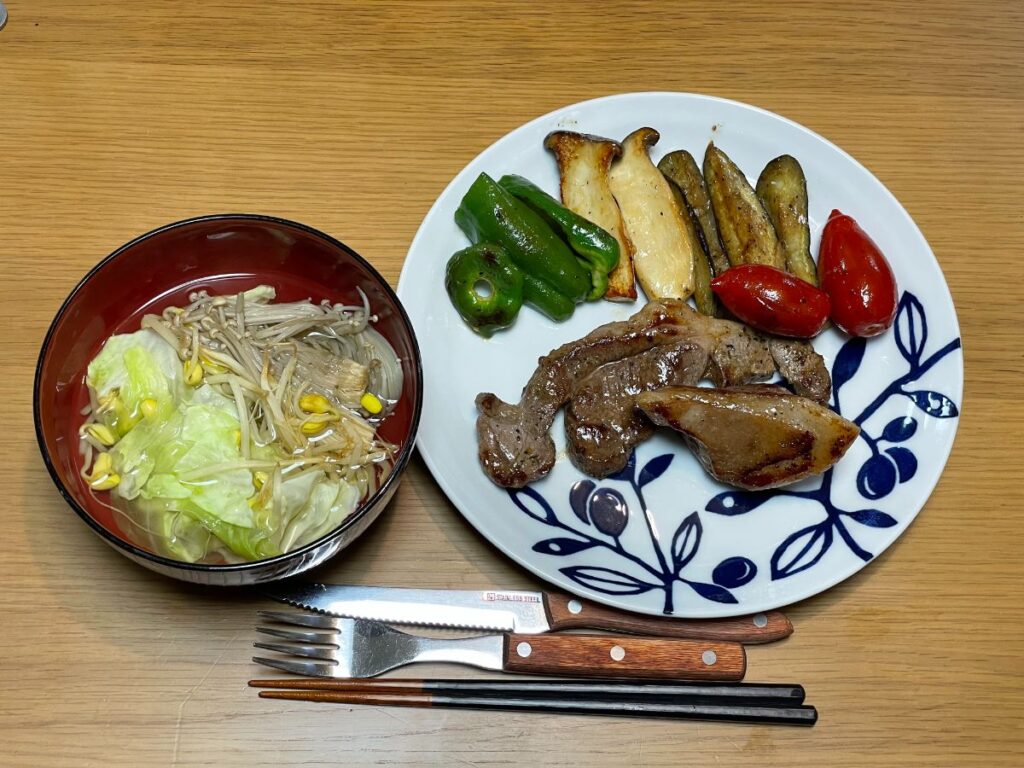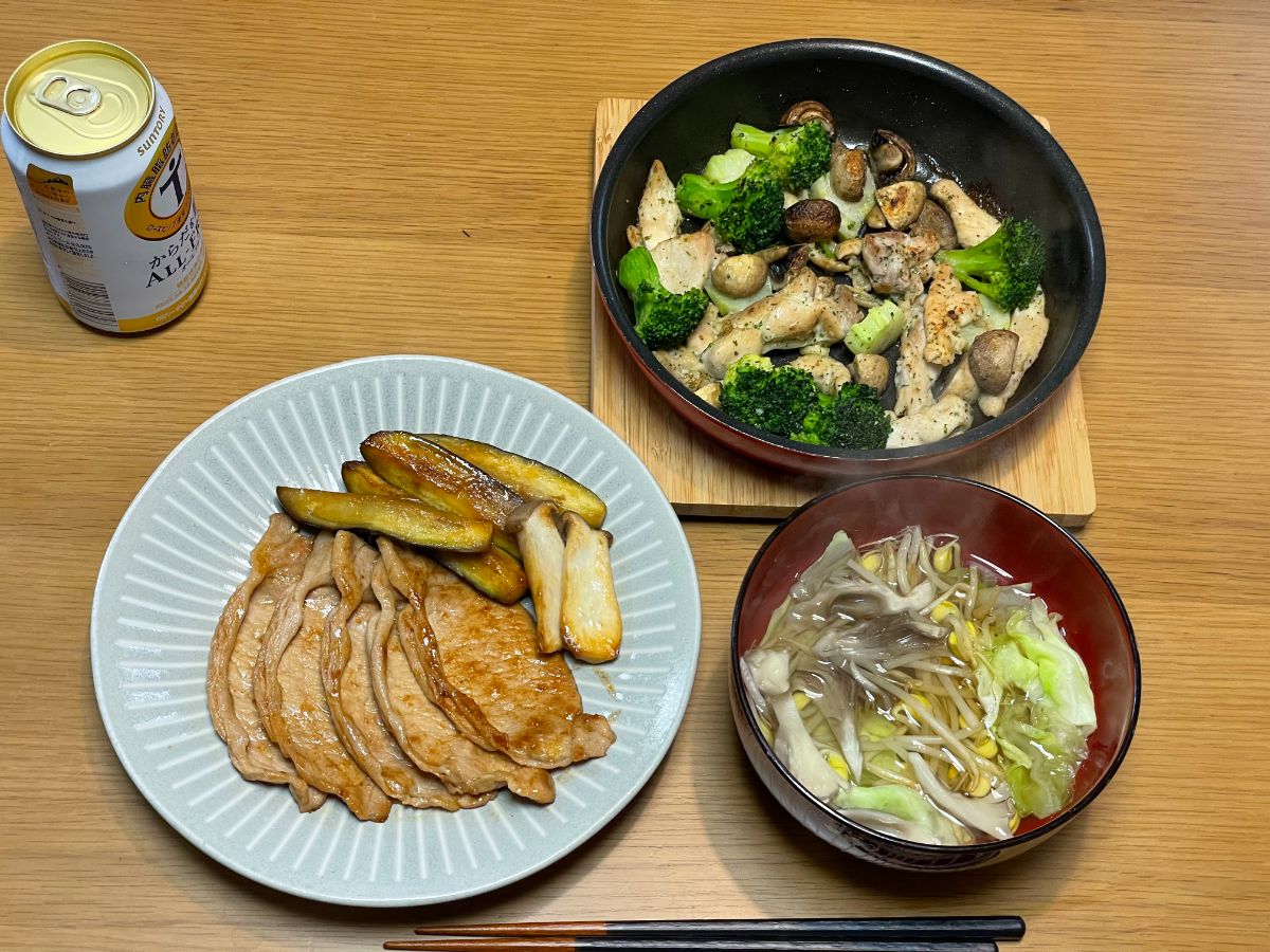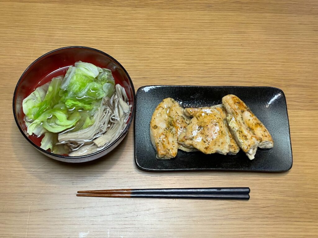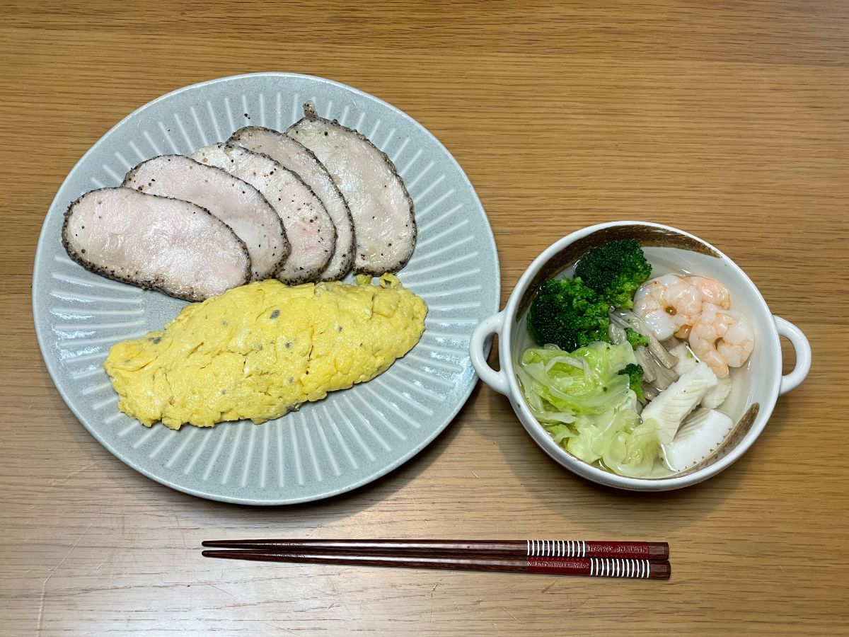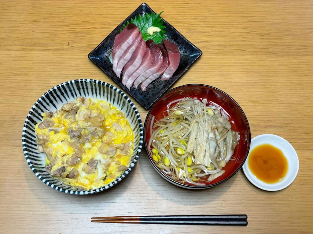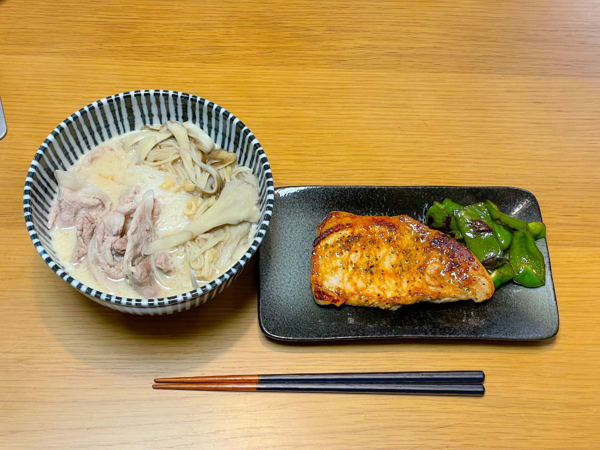 20:00 偽装親子丼、塩麹サーモン、無限ピーマンぶりフレーク添え、キャベツときのことブロッコリーのスープ