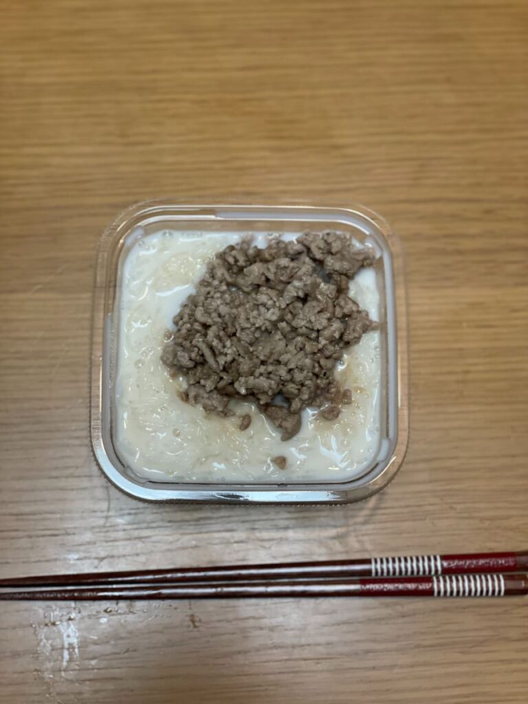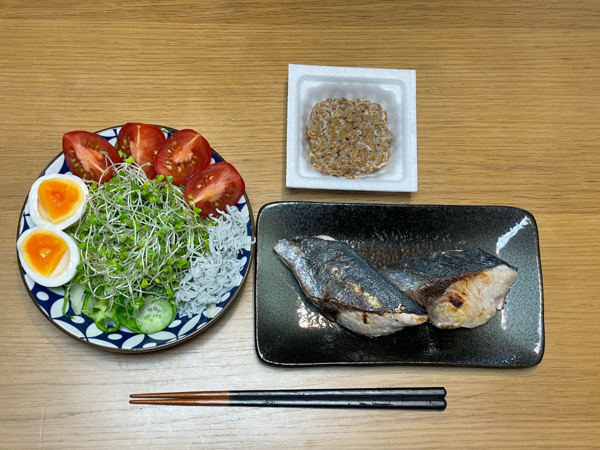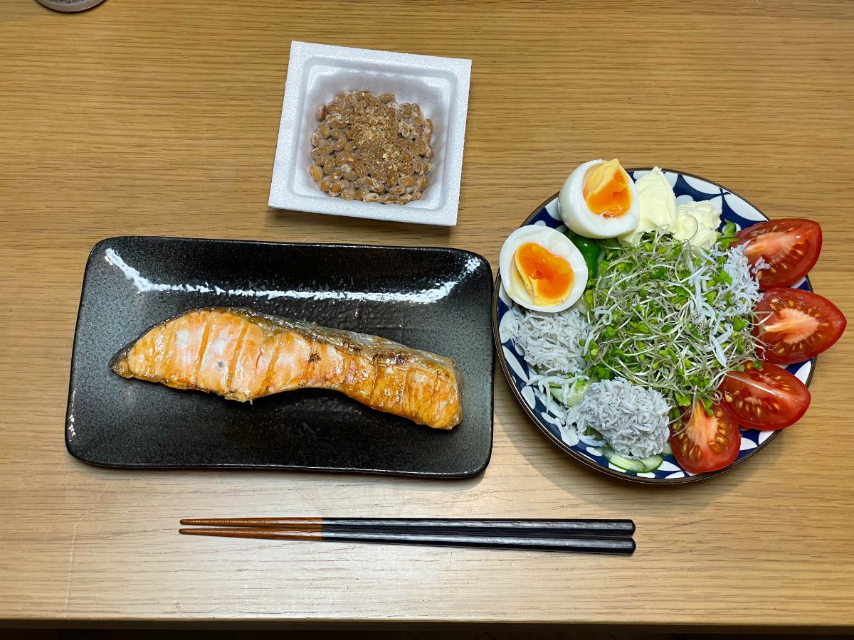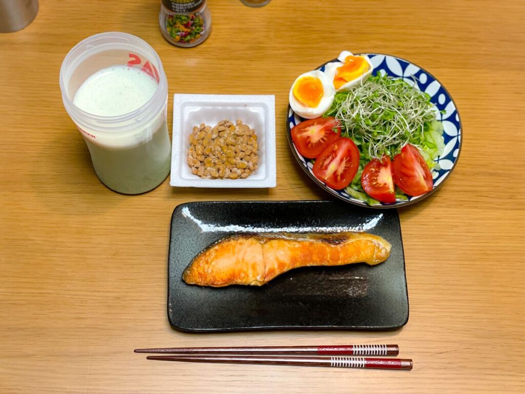 7:30 プロテインスムージー、サラダ、ゆで卵、納豆、焼き鮭