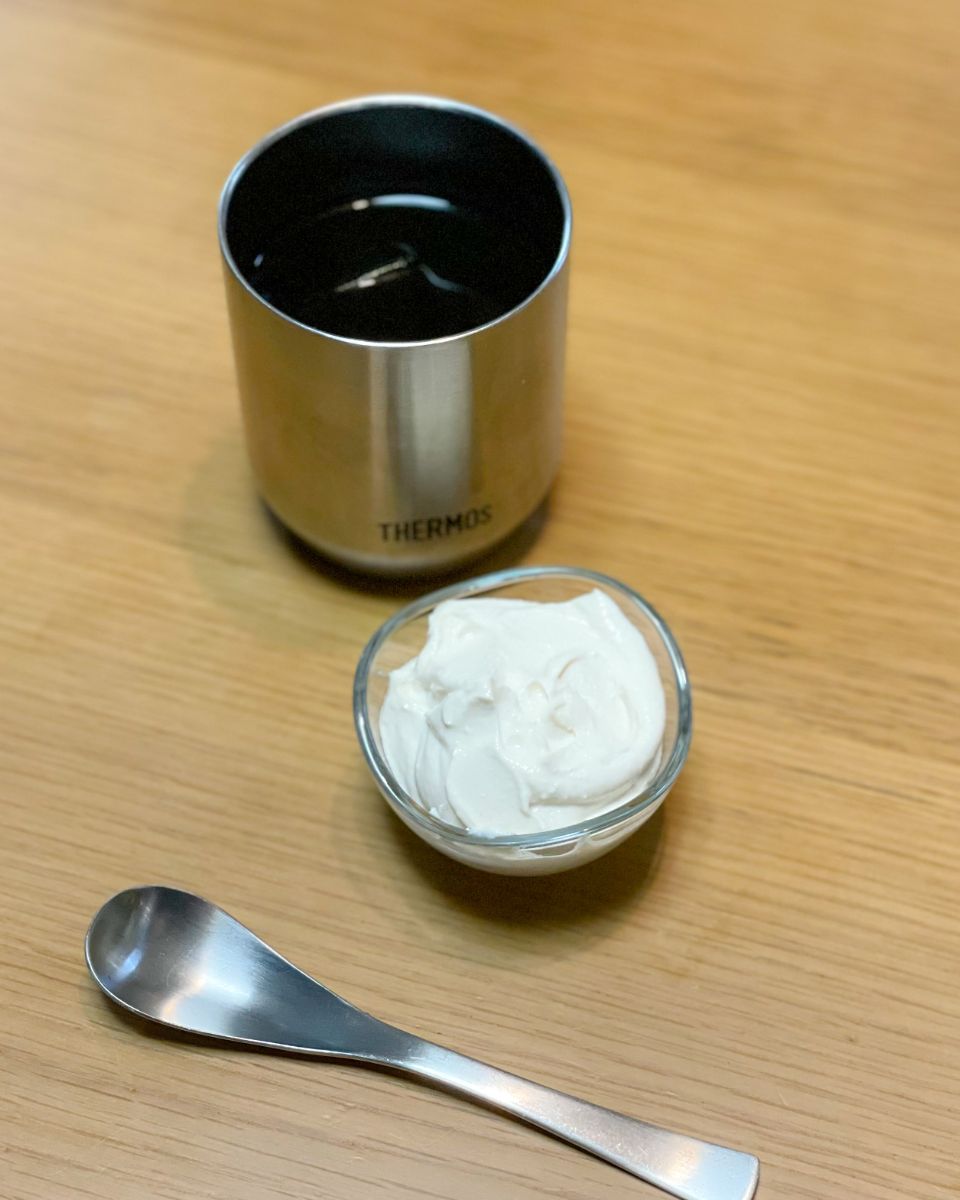 自家製レアチーズは、カッテージチーズにラカントとレモン汁をかけてなめらかになるまで混ぜたもの。オートミールココア蒸しパンはライザップレシピにも載っているもの。どうしても甘いものが食べたい時によいかも。