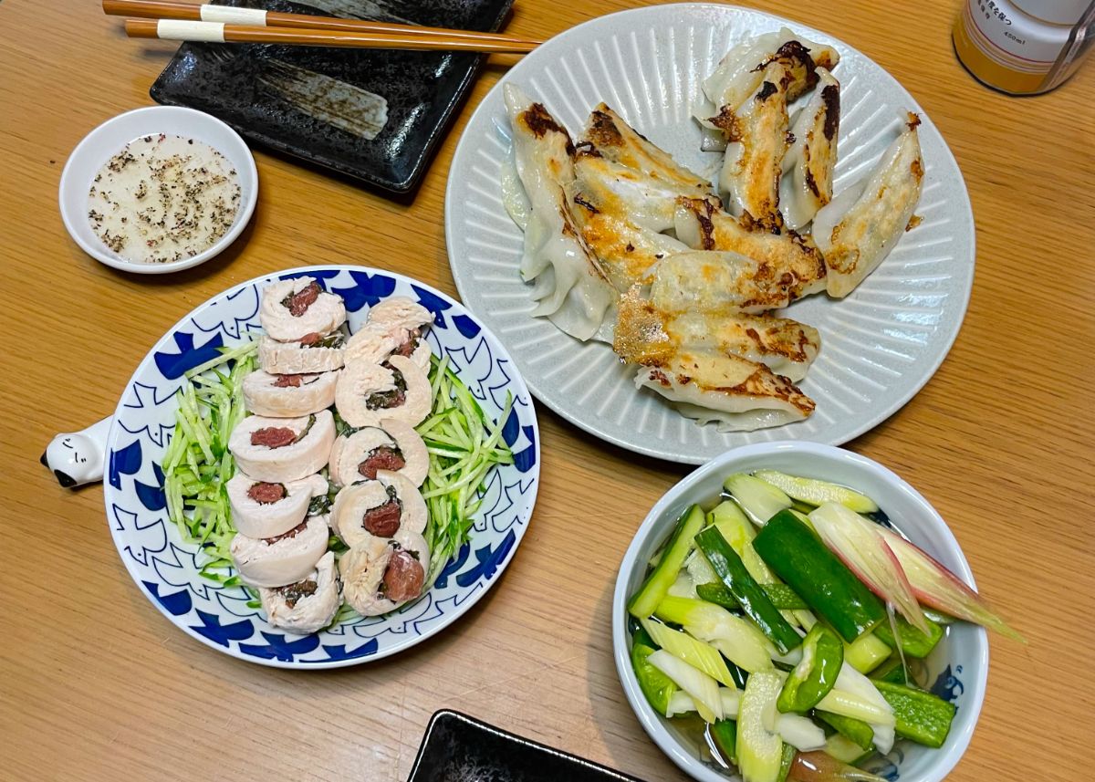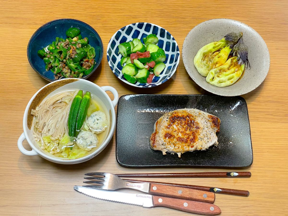 12:00 豚肉スパイシー焼き、レンチンなす、きゅうりの梅和え、ピーマンの鰯フレークあえ、鶏団子のスープ