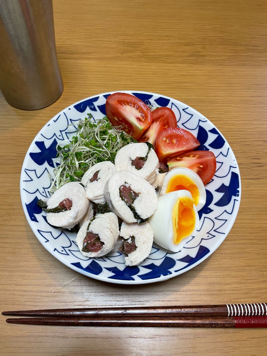 9:30 プロテインスムージー、鶏むね梅しそロール、ブロッコリースプラウト、トマト、ゆで卵