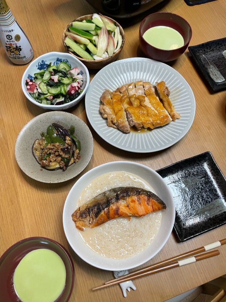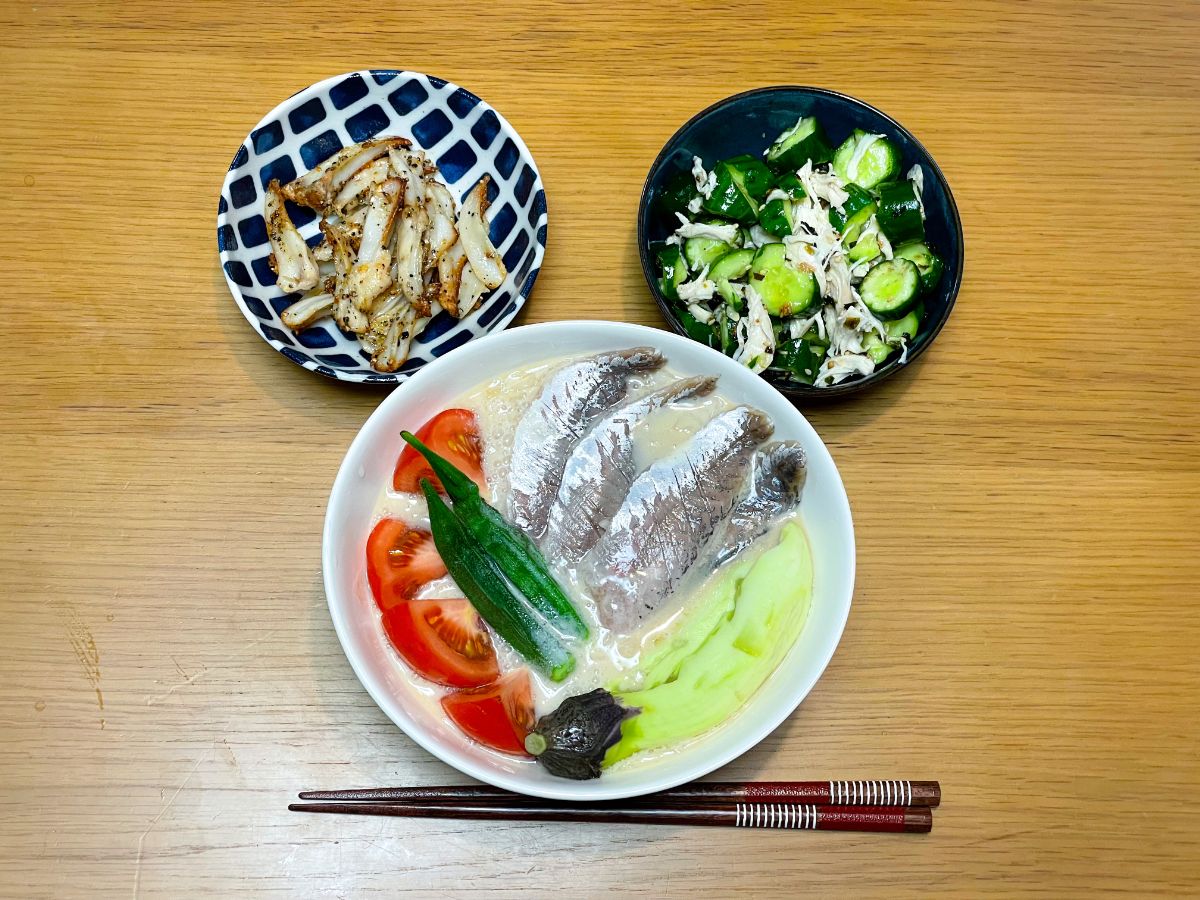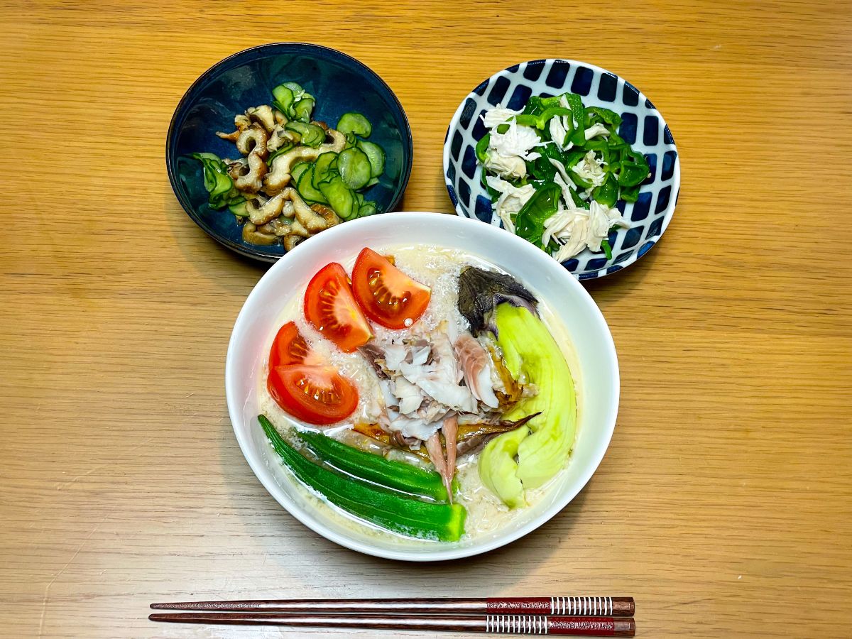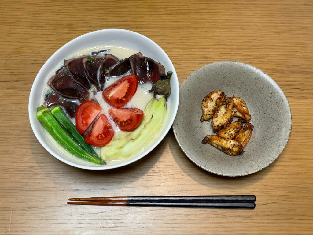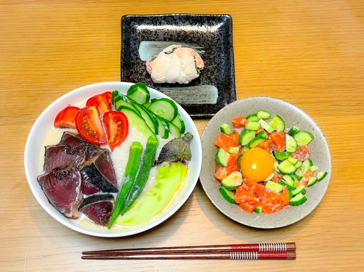 19:30 豆腐冷麺(カツオたたき、なす、おくら、きゅうり、トマト)、サーモンユッケ、鶏むね明太子まき