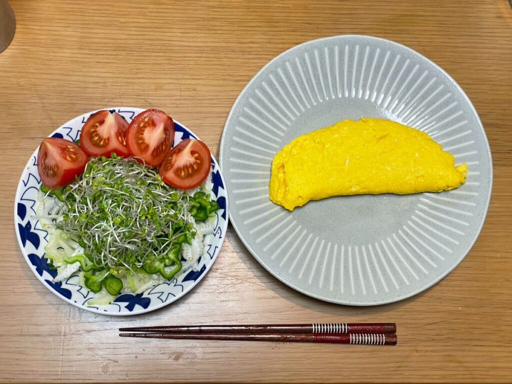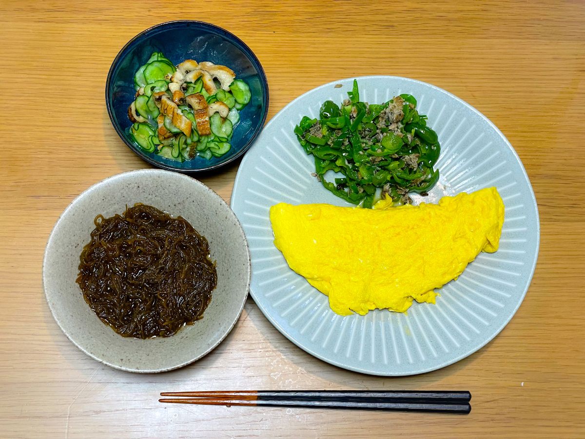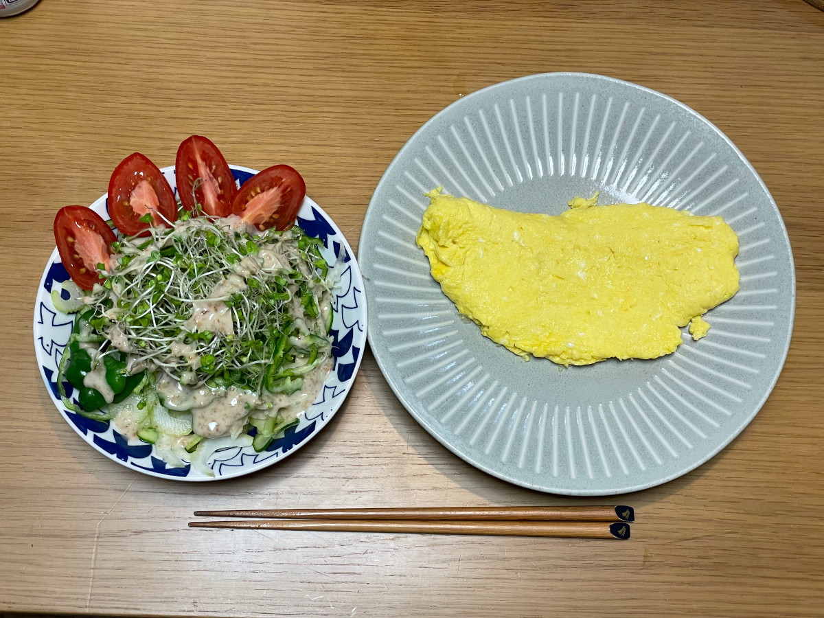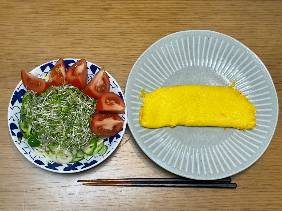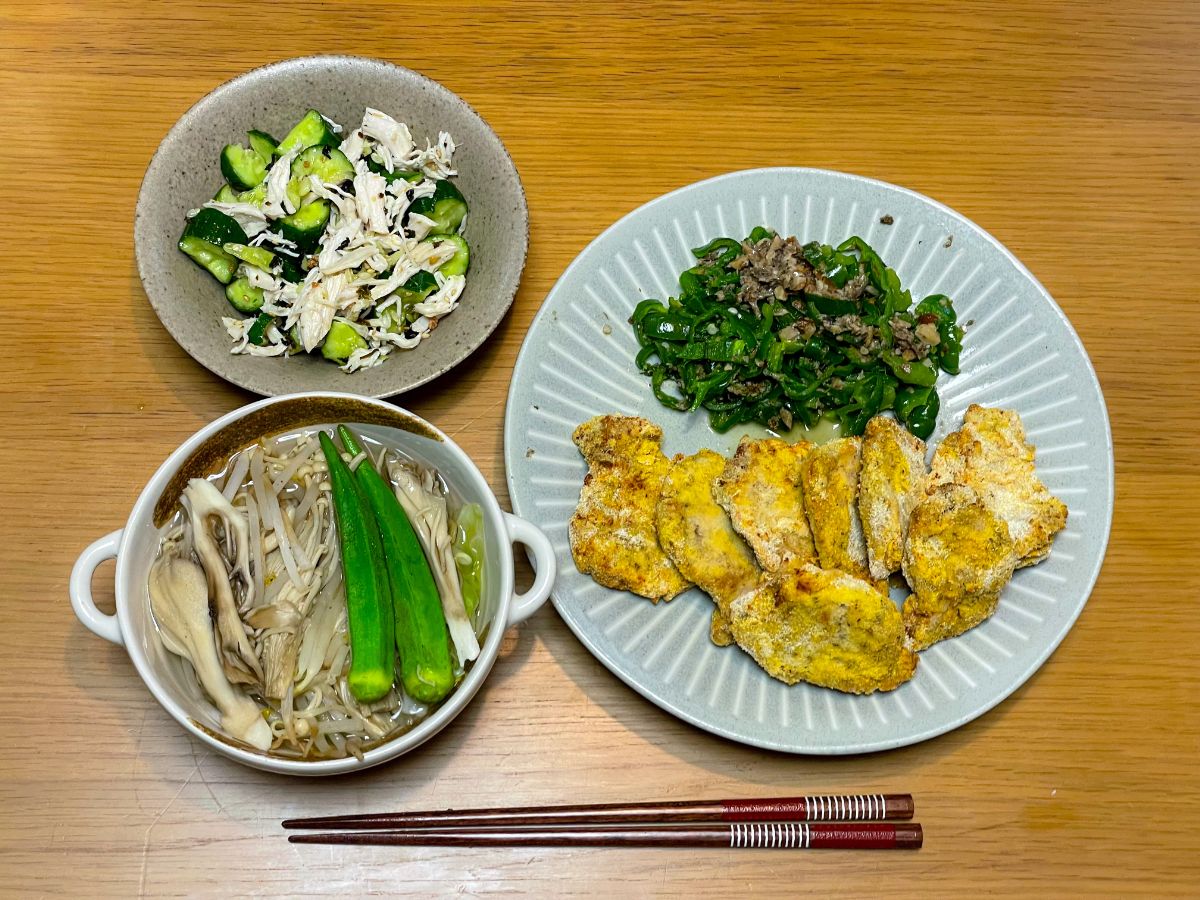 19:30 豆腐冷麺(カツオたたき、なす、おくら、きゅうり、トマト)、サーモンユッケ、鶏むね明太子まき