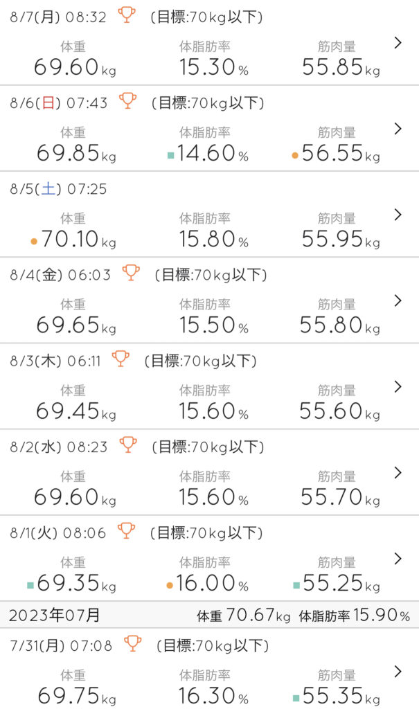体脂肪率は日曜日についに14%台を記録。食事量減らしたのが効果出てそう。お腹は空くけど。