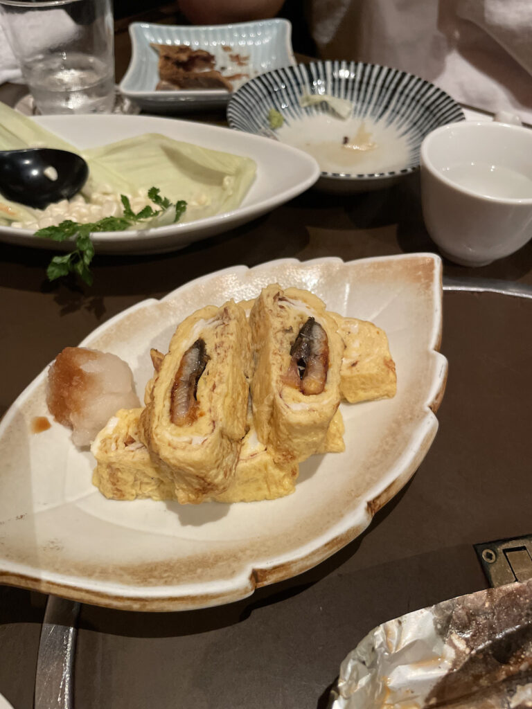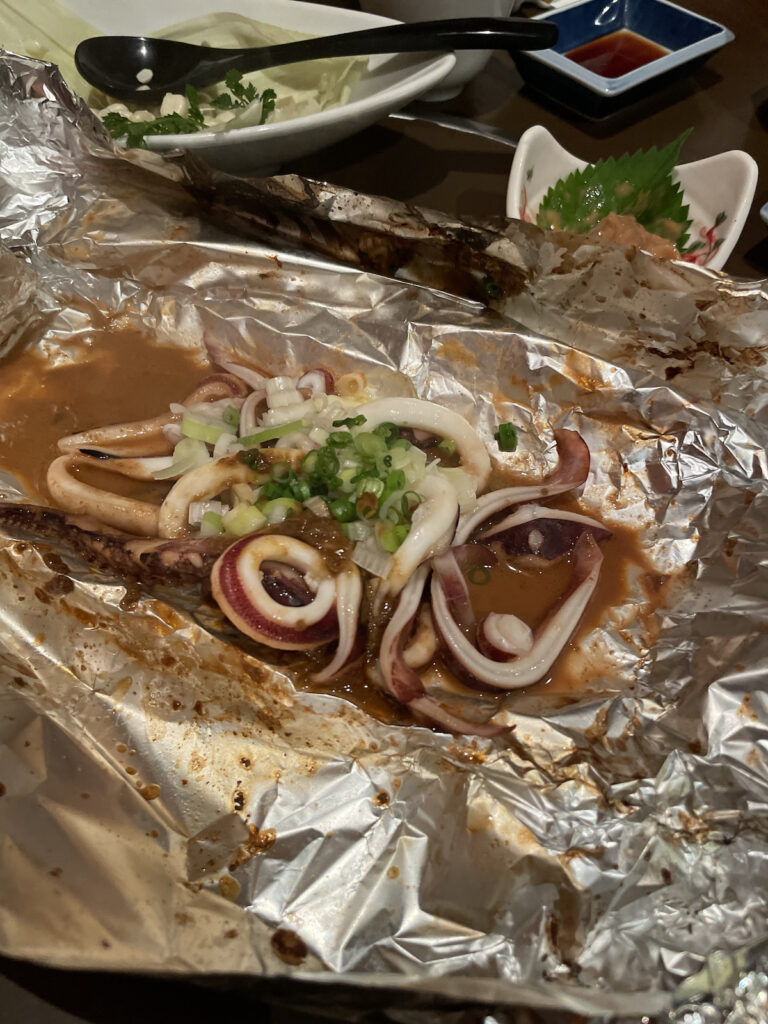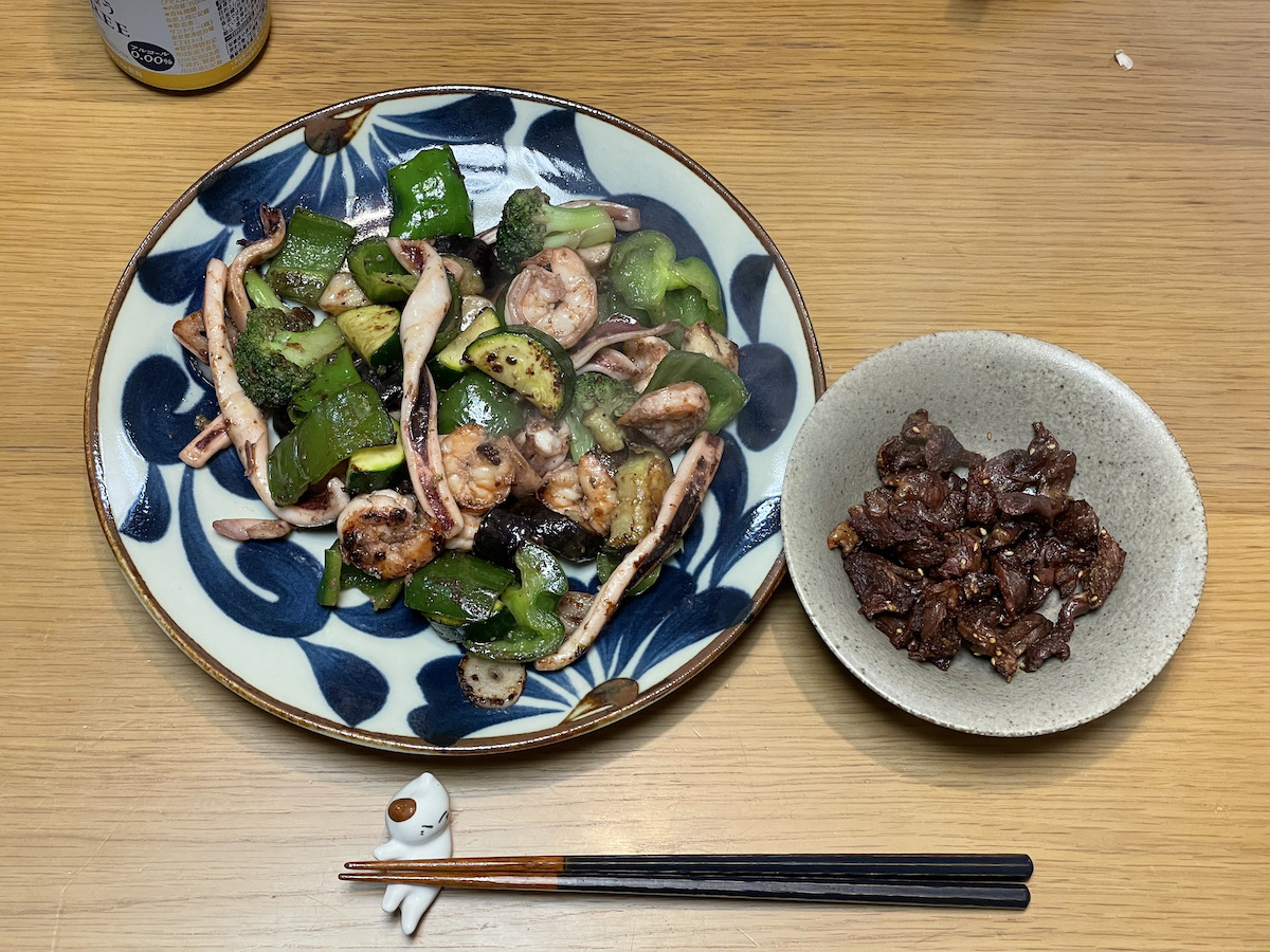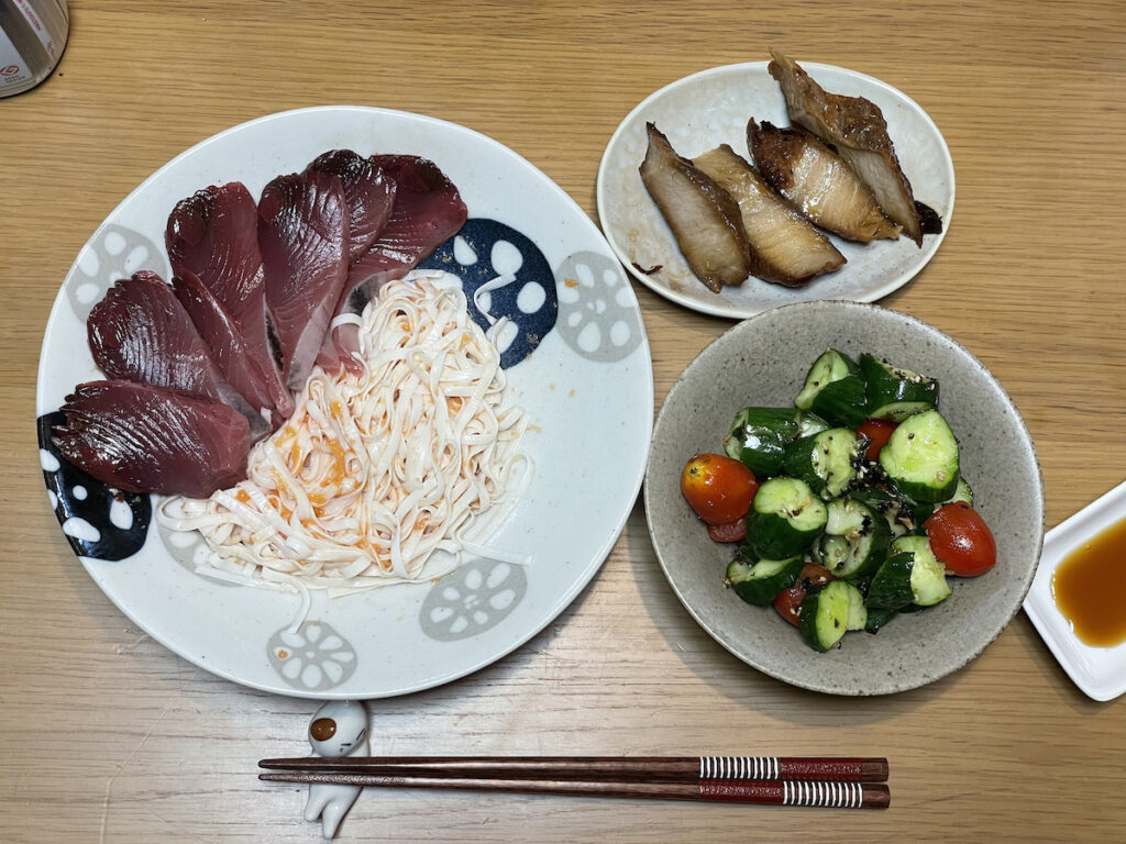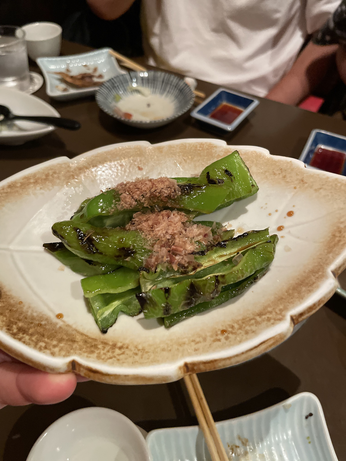 18:00 刺身、マグロカツ、イカの肝焼き、う巻き、万願寺とうがらし焼き、ビール、日本酒3合