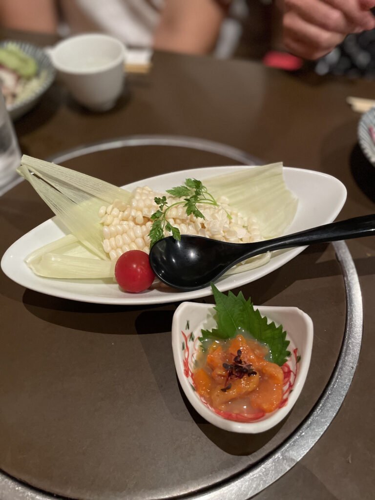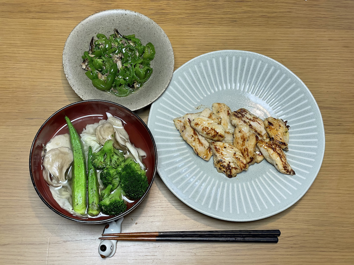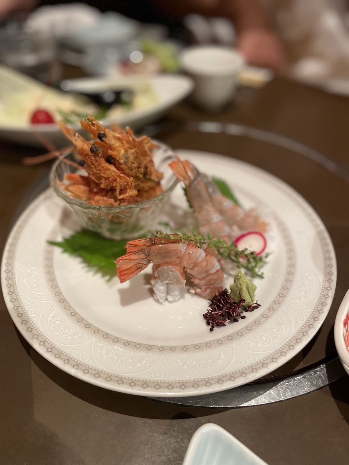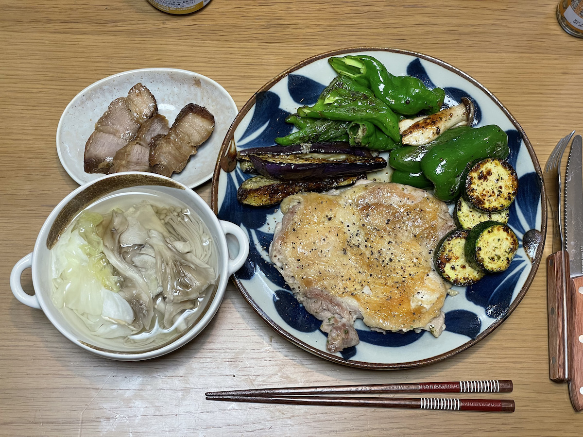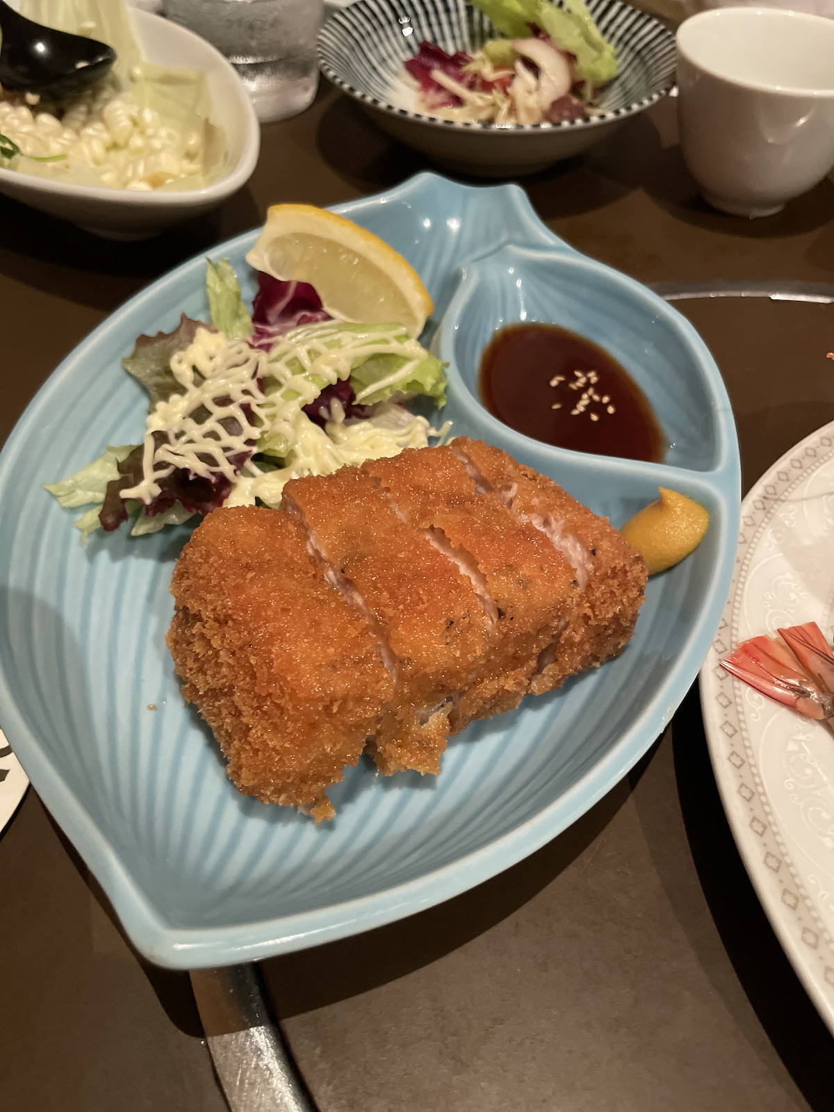 18:00 刺身、マグロカツ、イカの肝焼き、う巻き、万願寺とうがらし焼き、ビール、日本酒3合