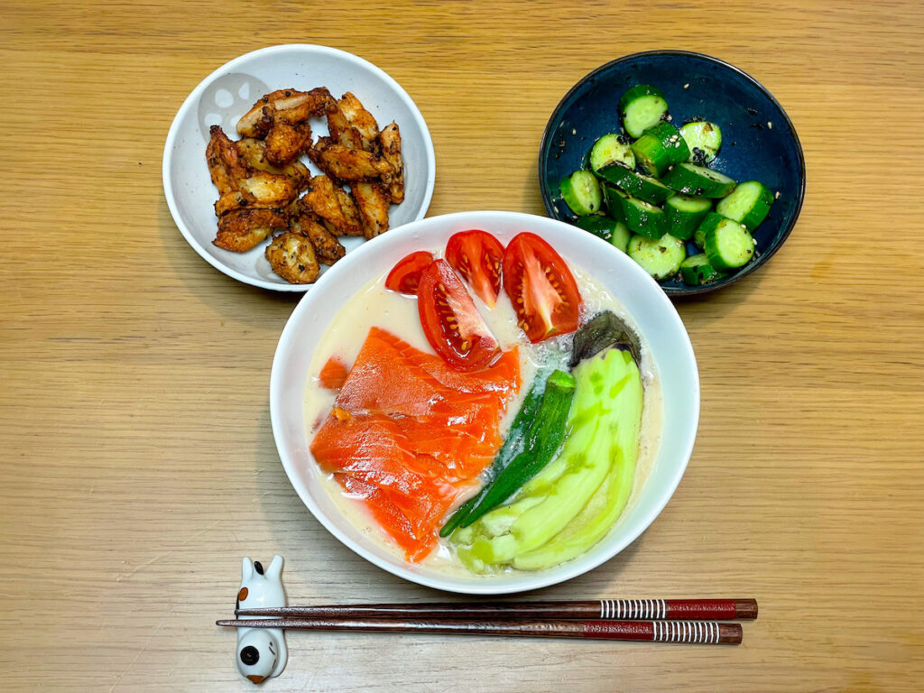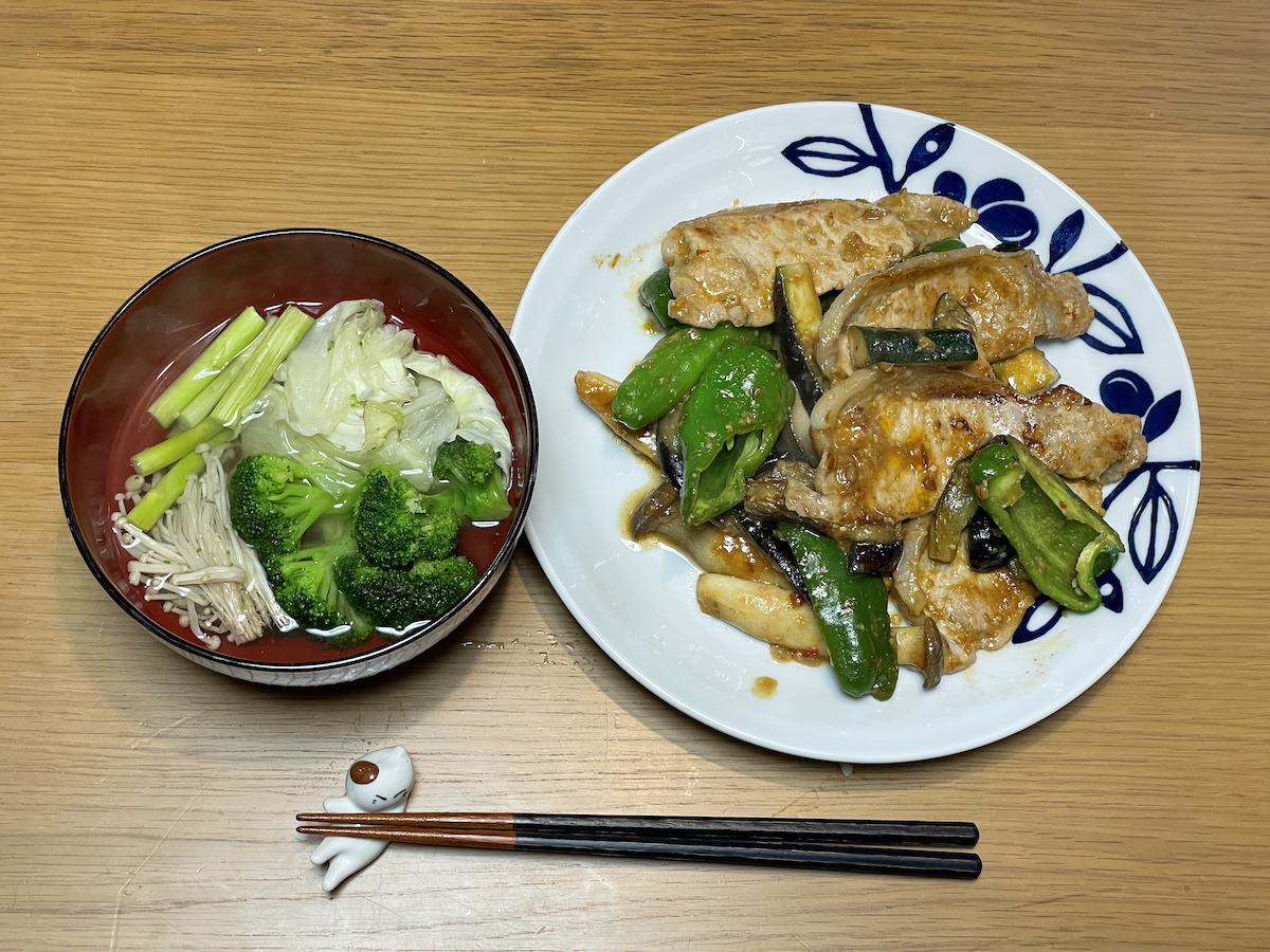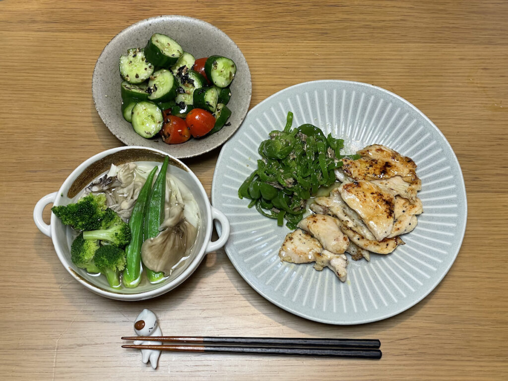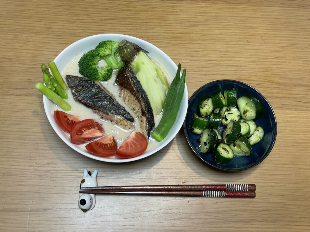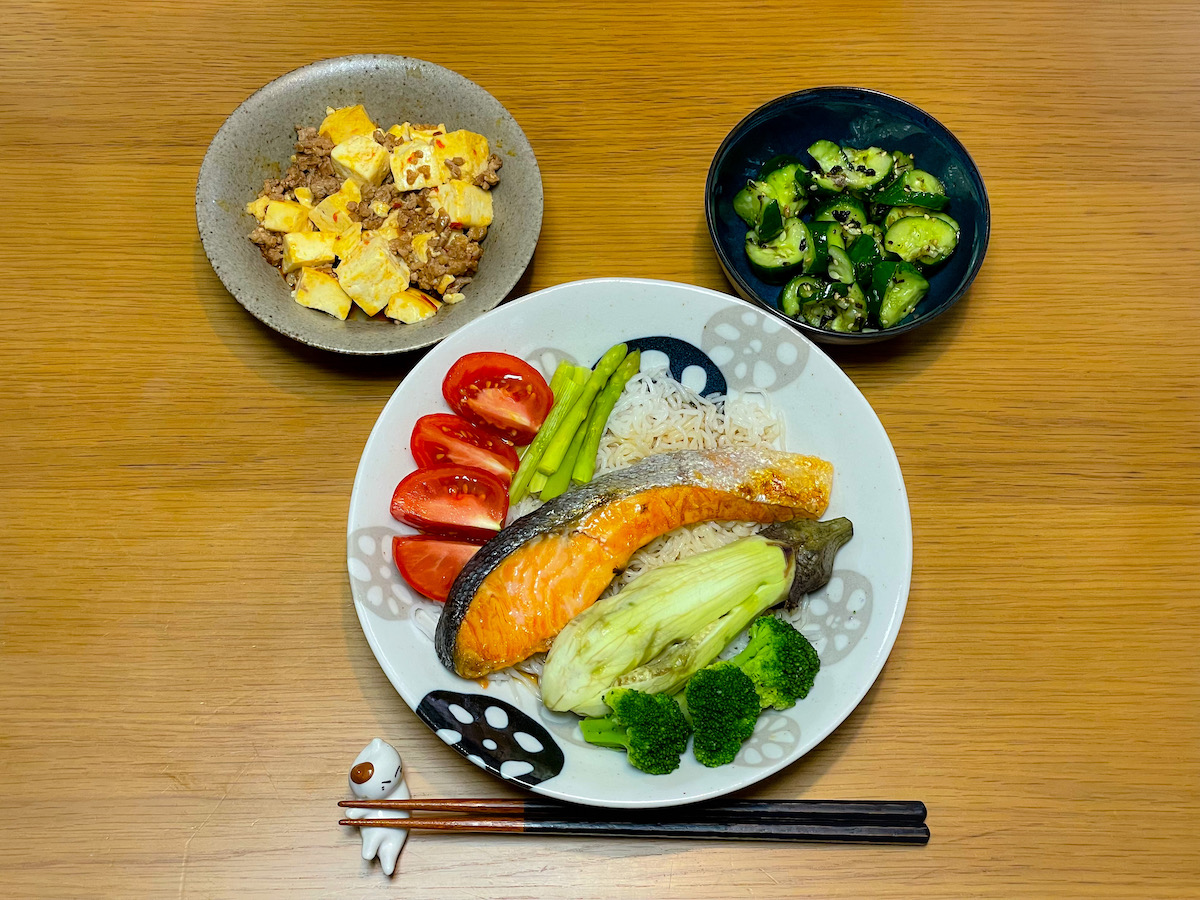 18:00 刺身、マグロカツ、イカの肝焼き、う巻き、万願寺とうがらし焼き、ビール、日本酒3合