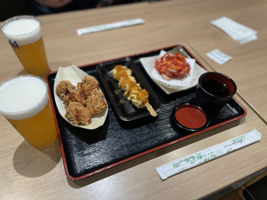 16:00 唐揚げ、味噌ポテト、紅生姜かきあげ、豚味噌焼き、わらじかつ、ビール3杯