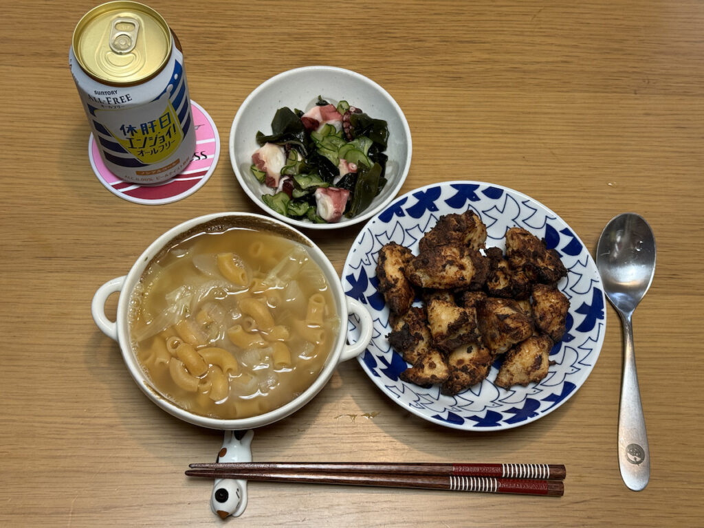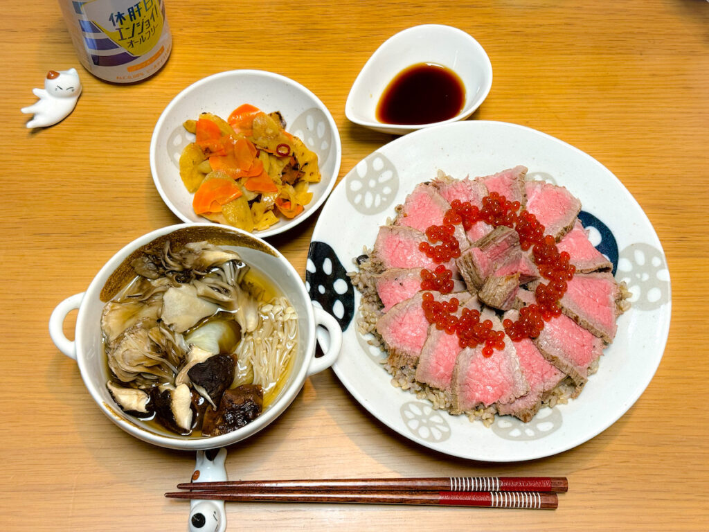 20:00 鮭のムニエル、ノンフライ唐揚げ、ピクルス、ごはん、いくら