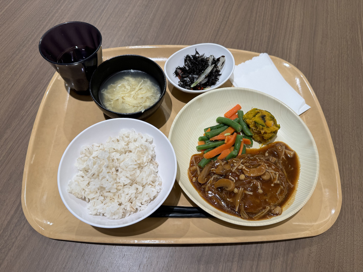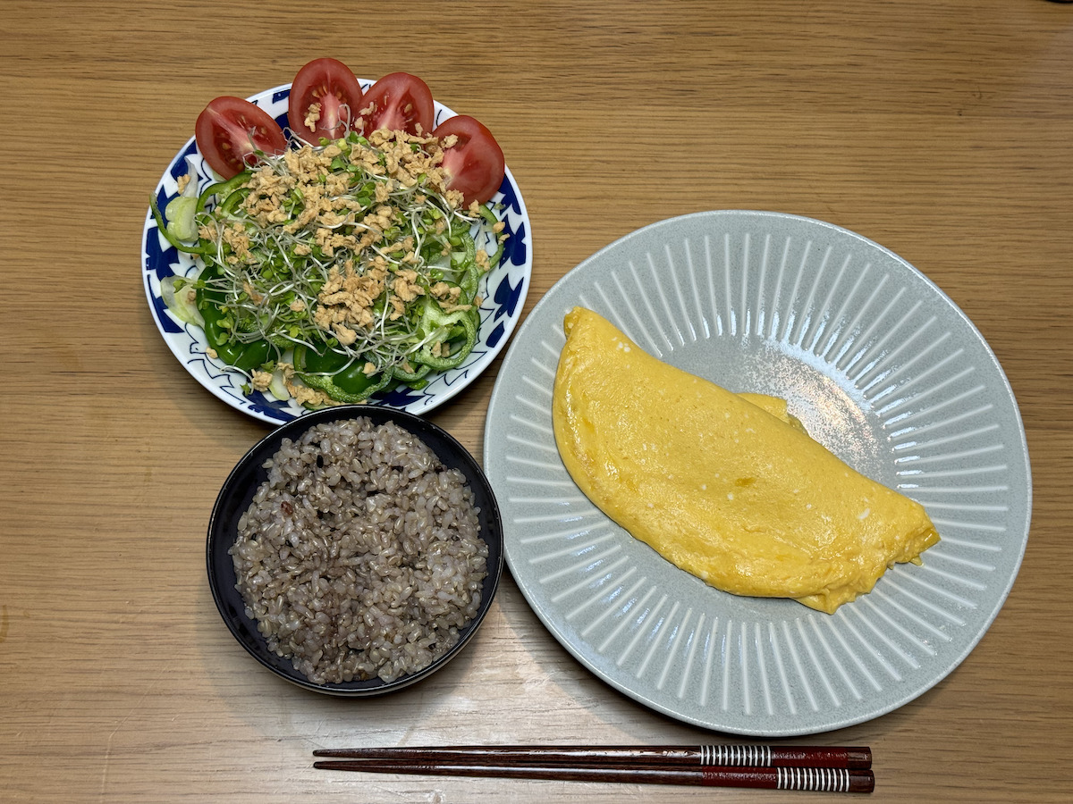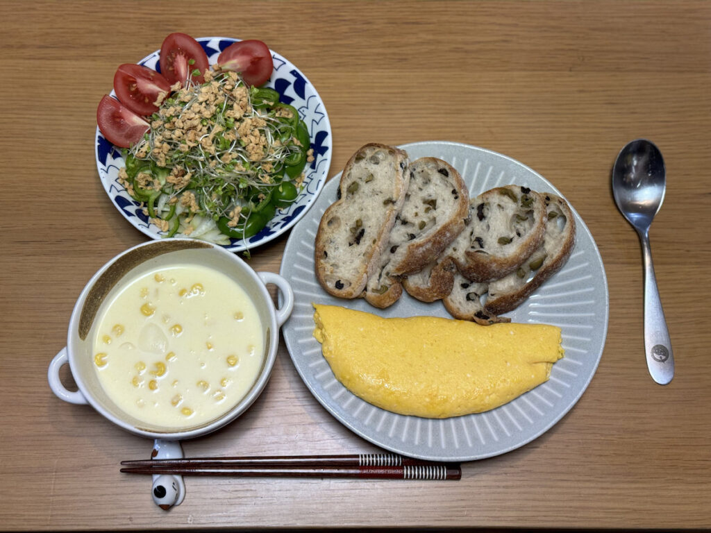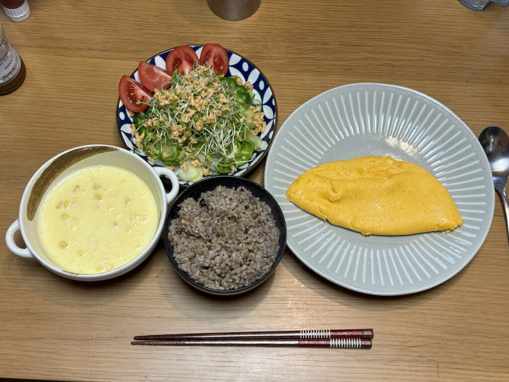 7:45 サラダ、オムレツ、玄米ご飯、豆乳コーンスープ