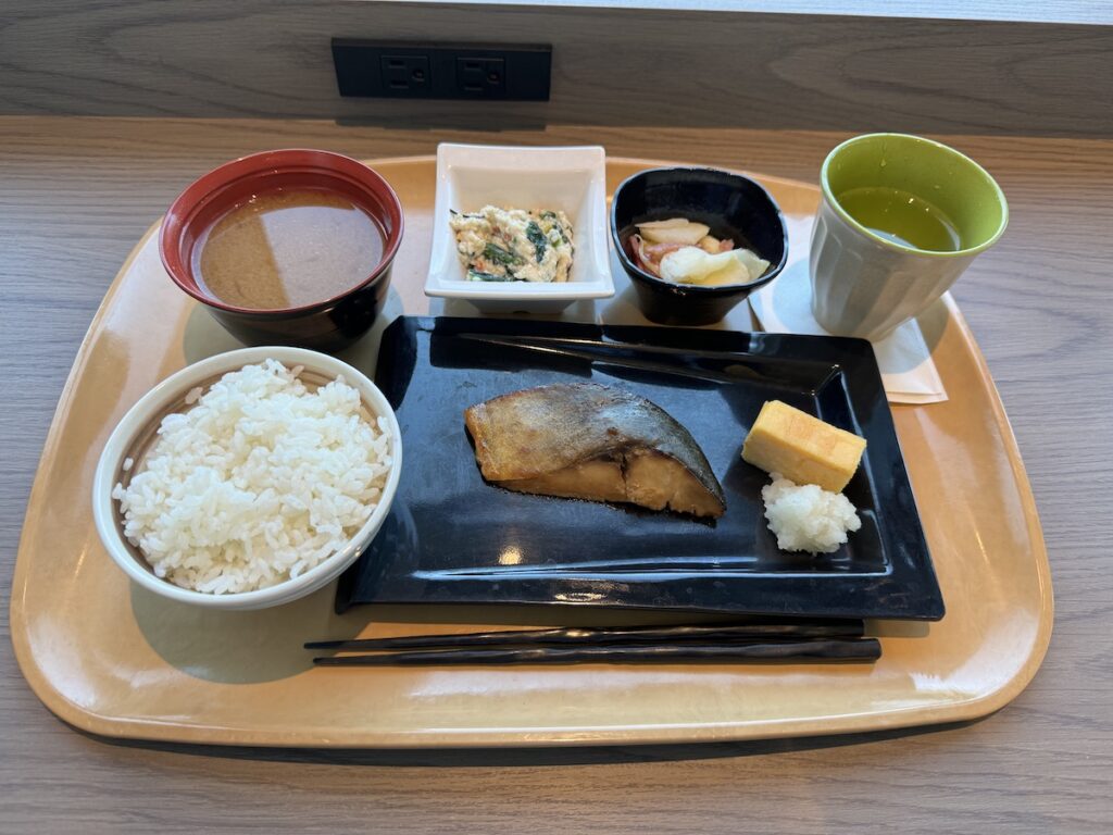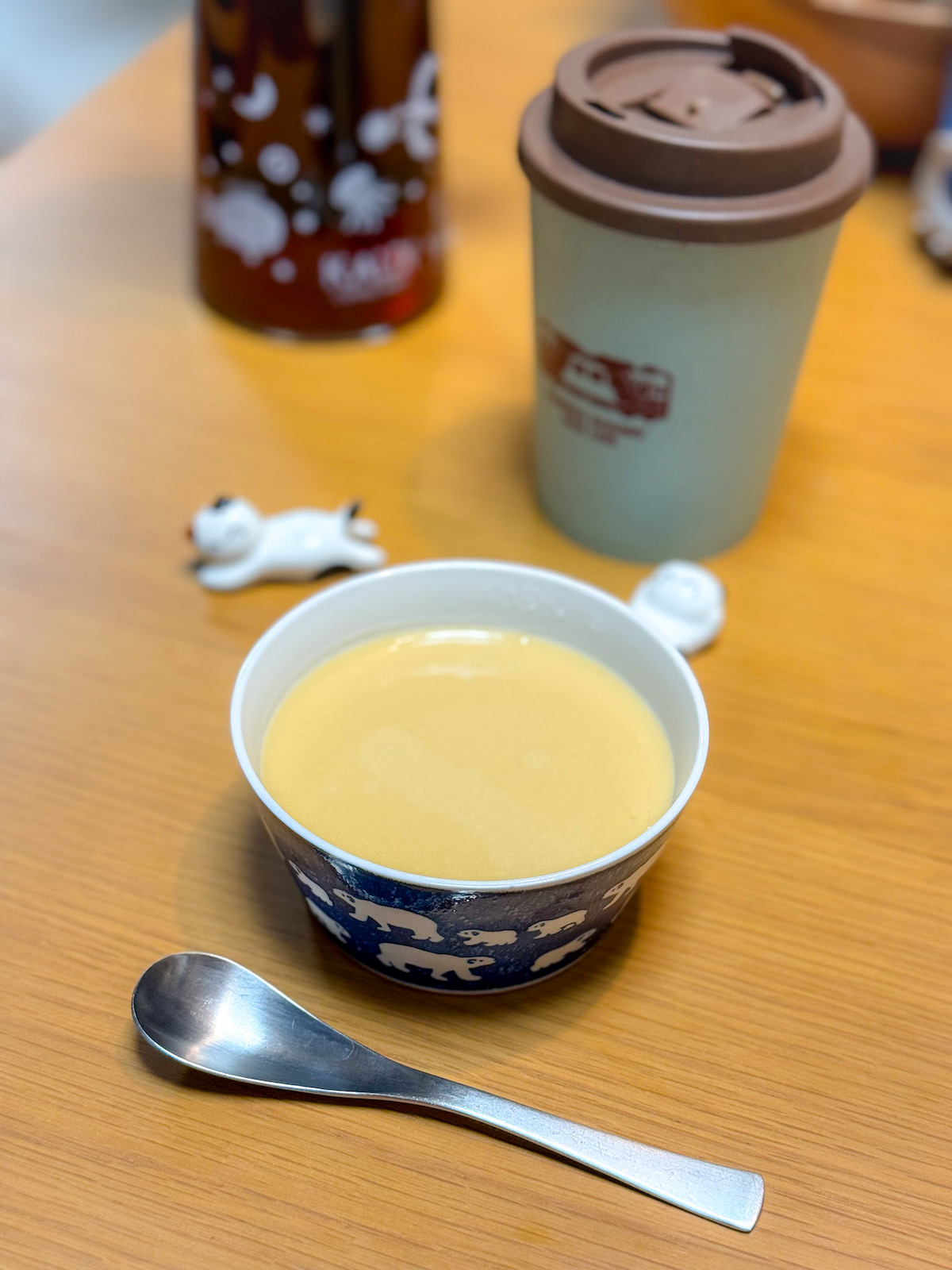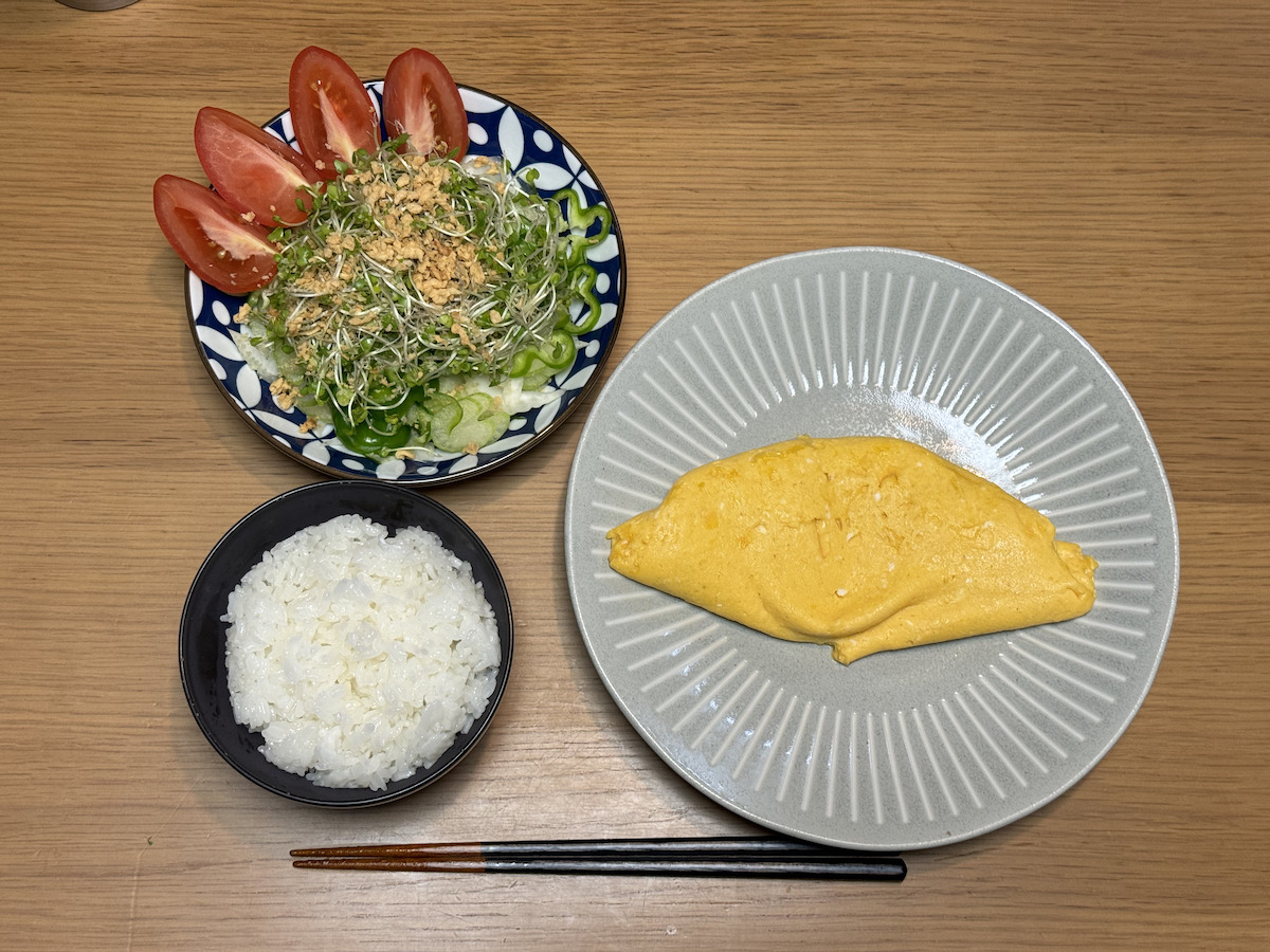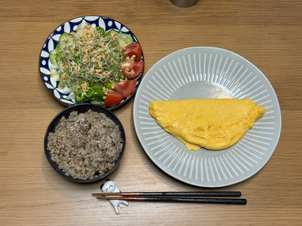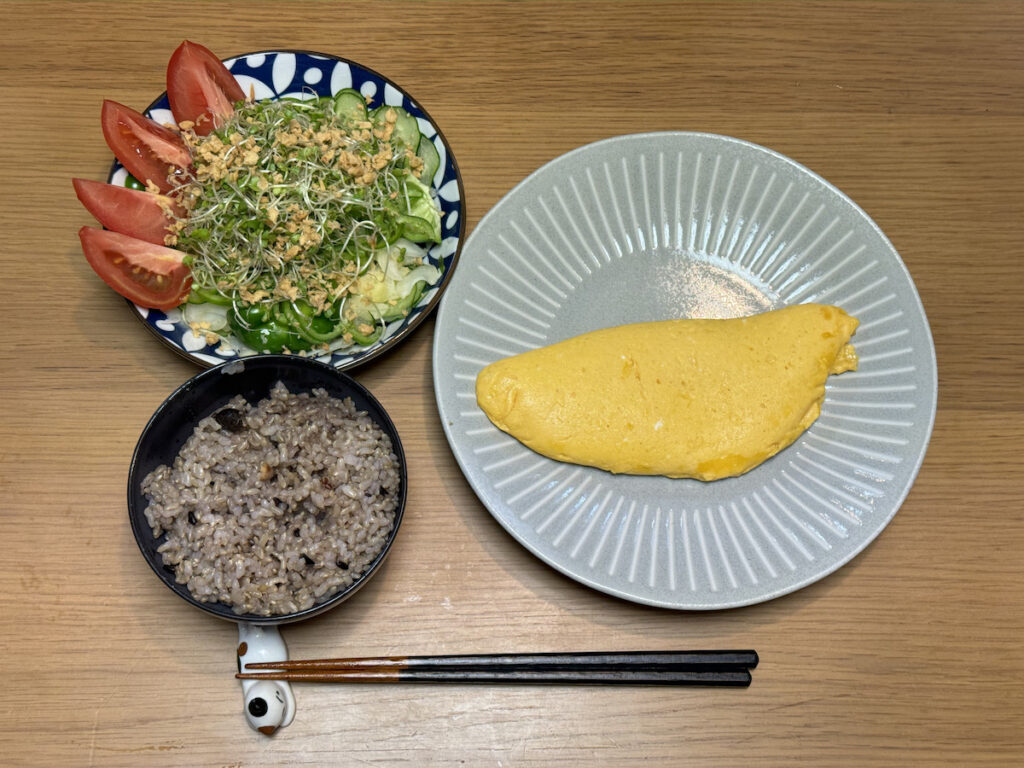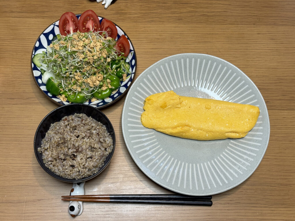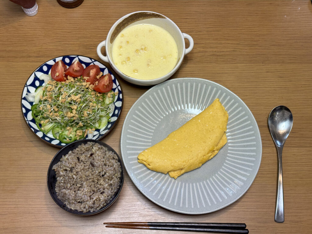 7:45 サラダ、オムレツ、玄米ご飯、豆乳コーンスープ