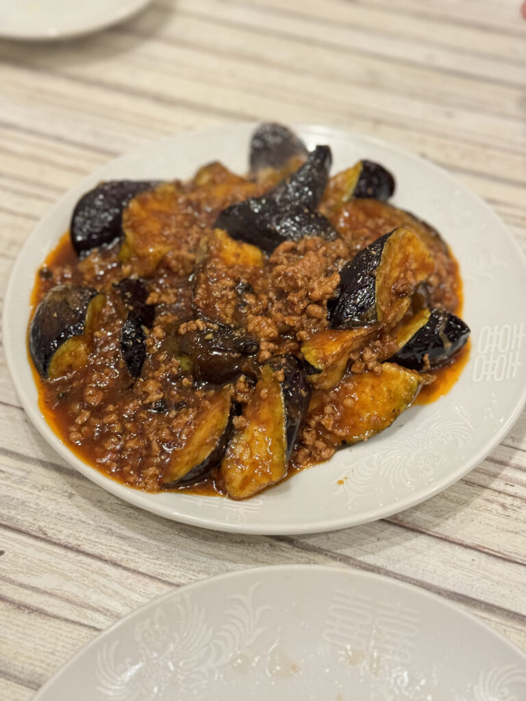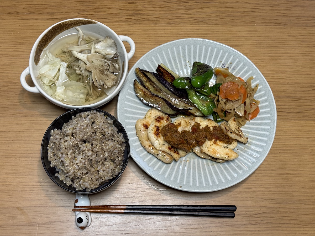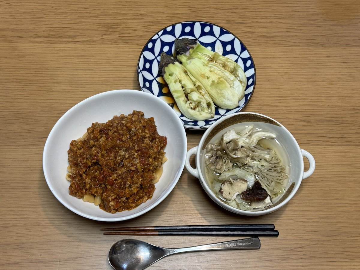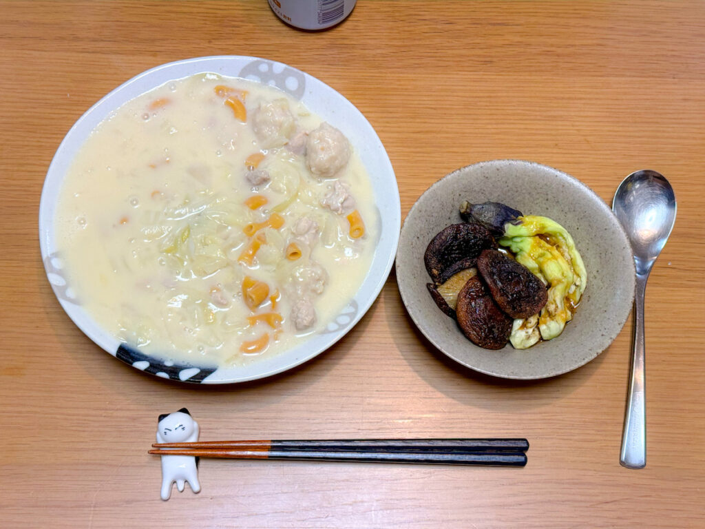 20:30 鶏団子とキャベツの豆乳クリームパスタ、蒸しナス、椎茸炙り焼き