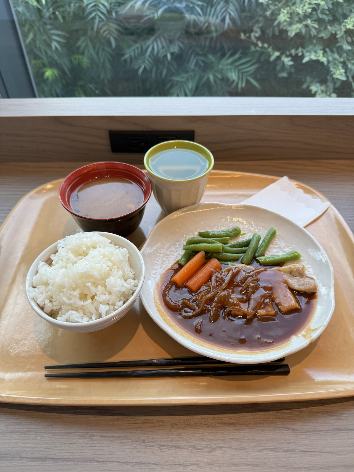 11:30 ミートソースパスタ(マメロニ)、食物繊維汁、ナス生姜醤油